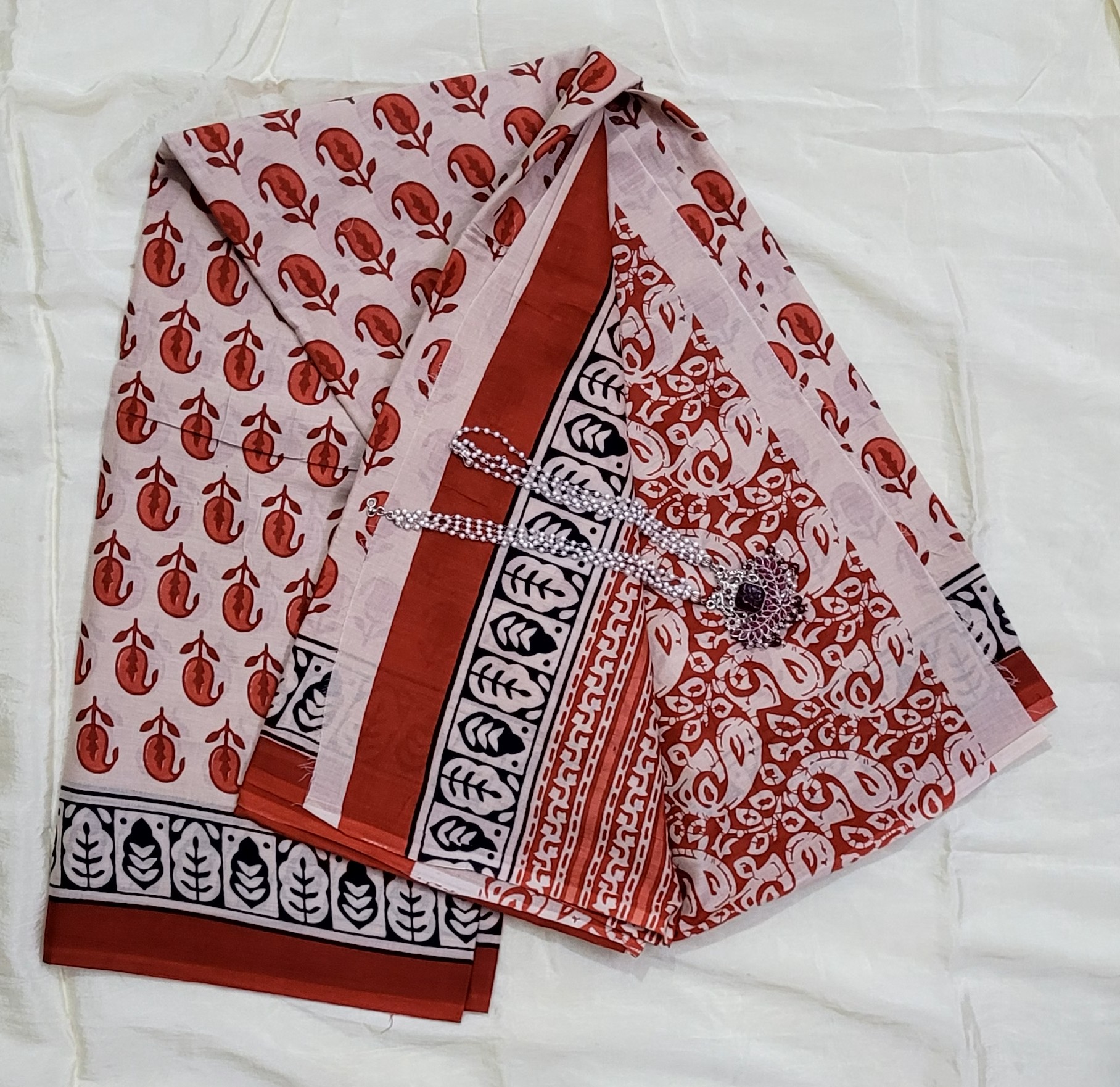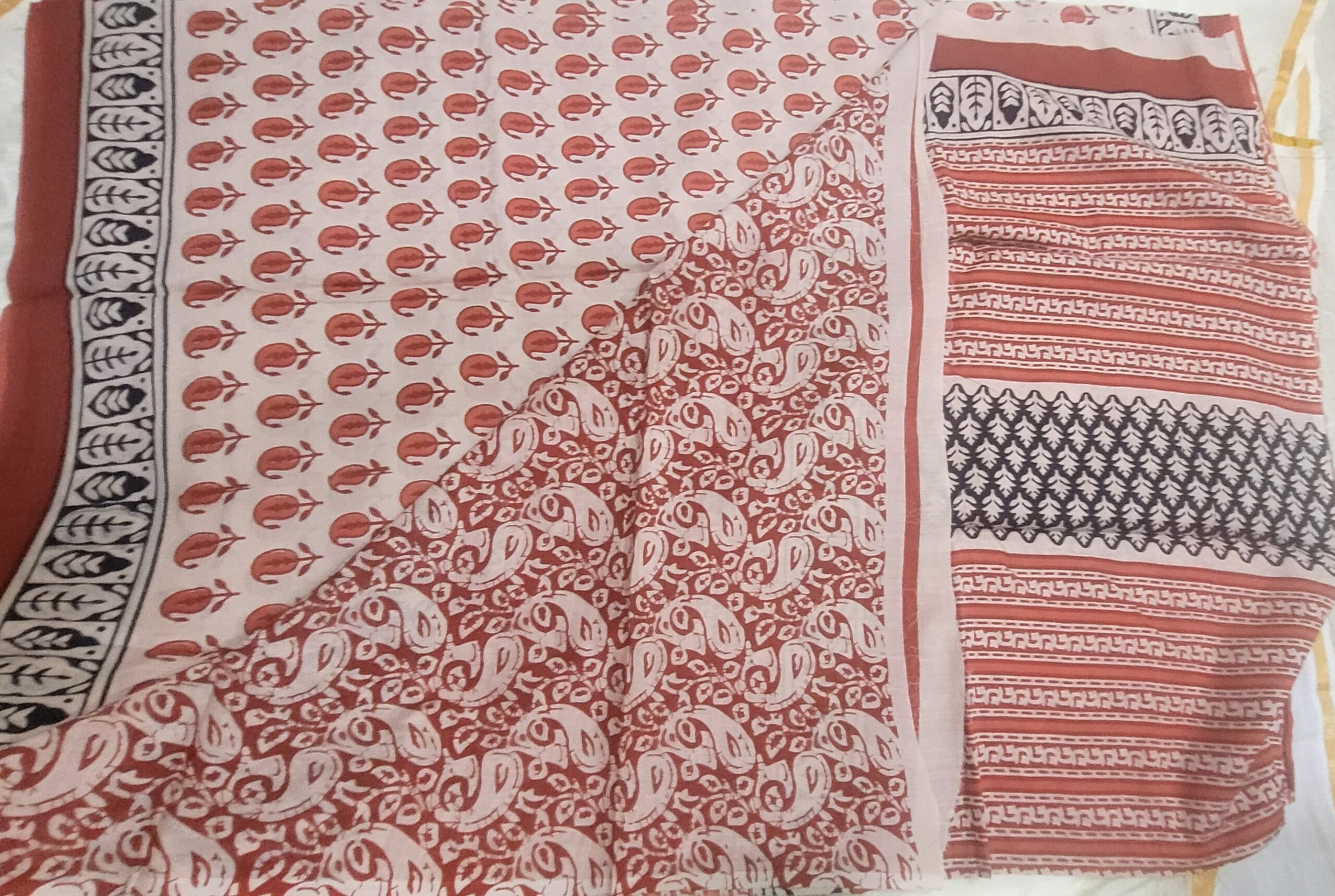 | Color Palette | Soft off-white base with earthy red buti motifs and deep black handblock borders, all crafted using natural dyes. |