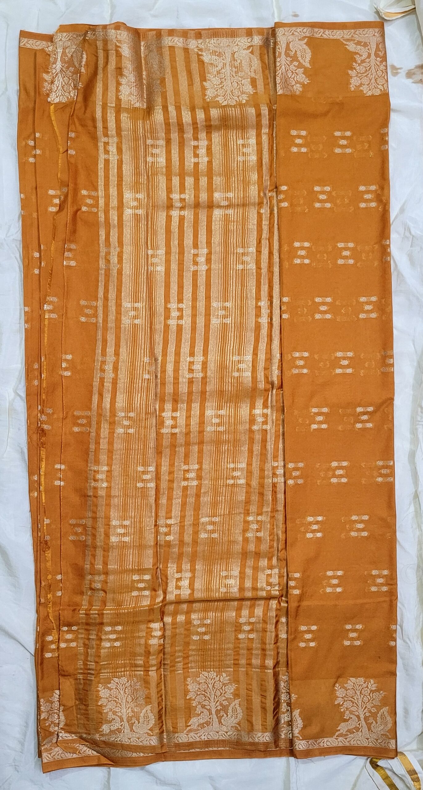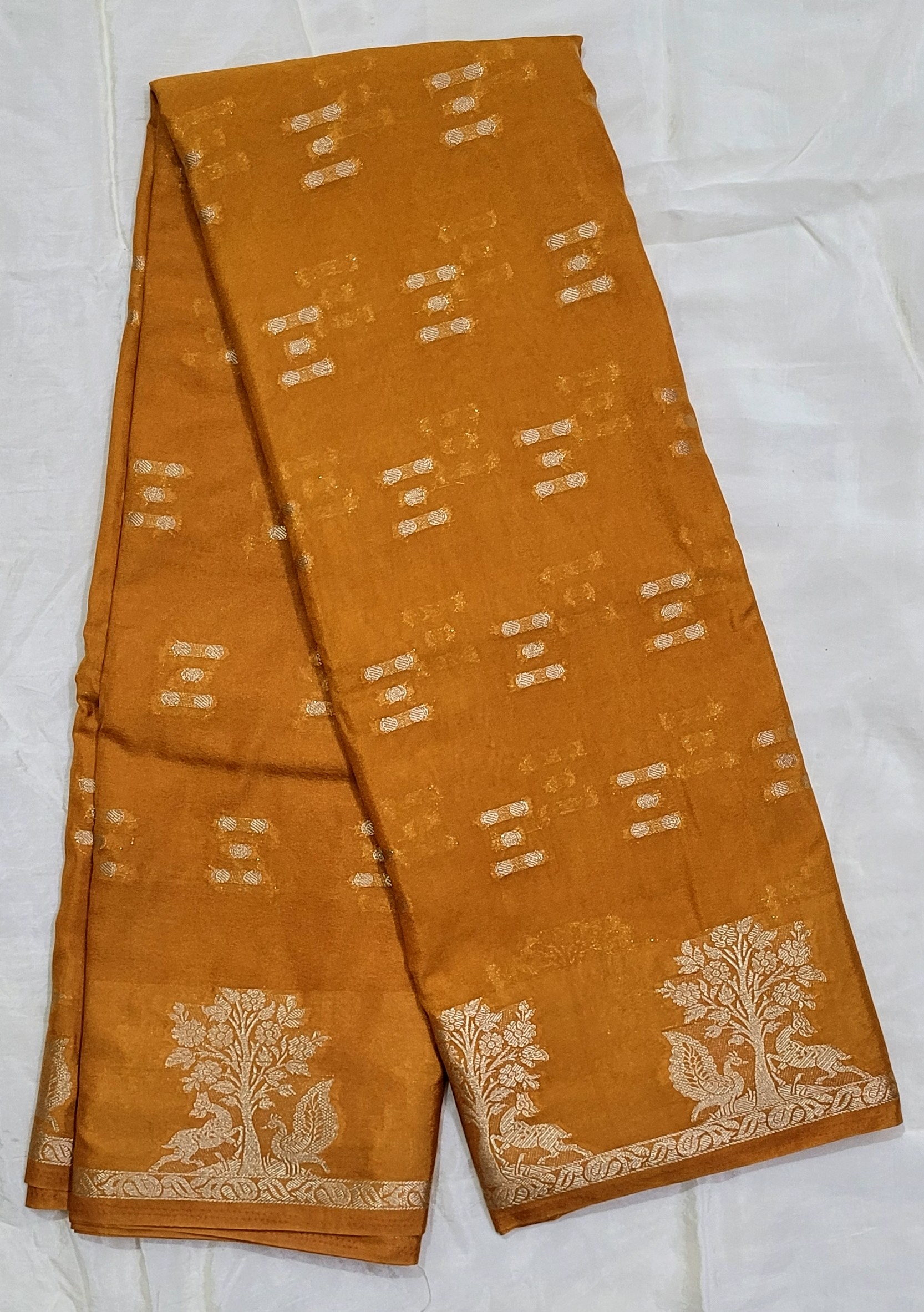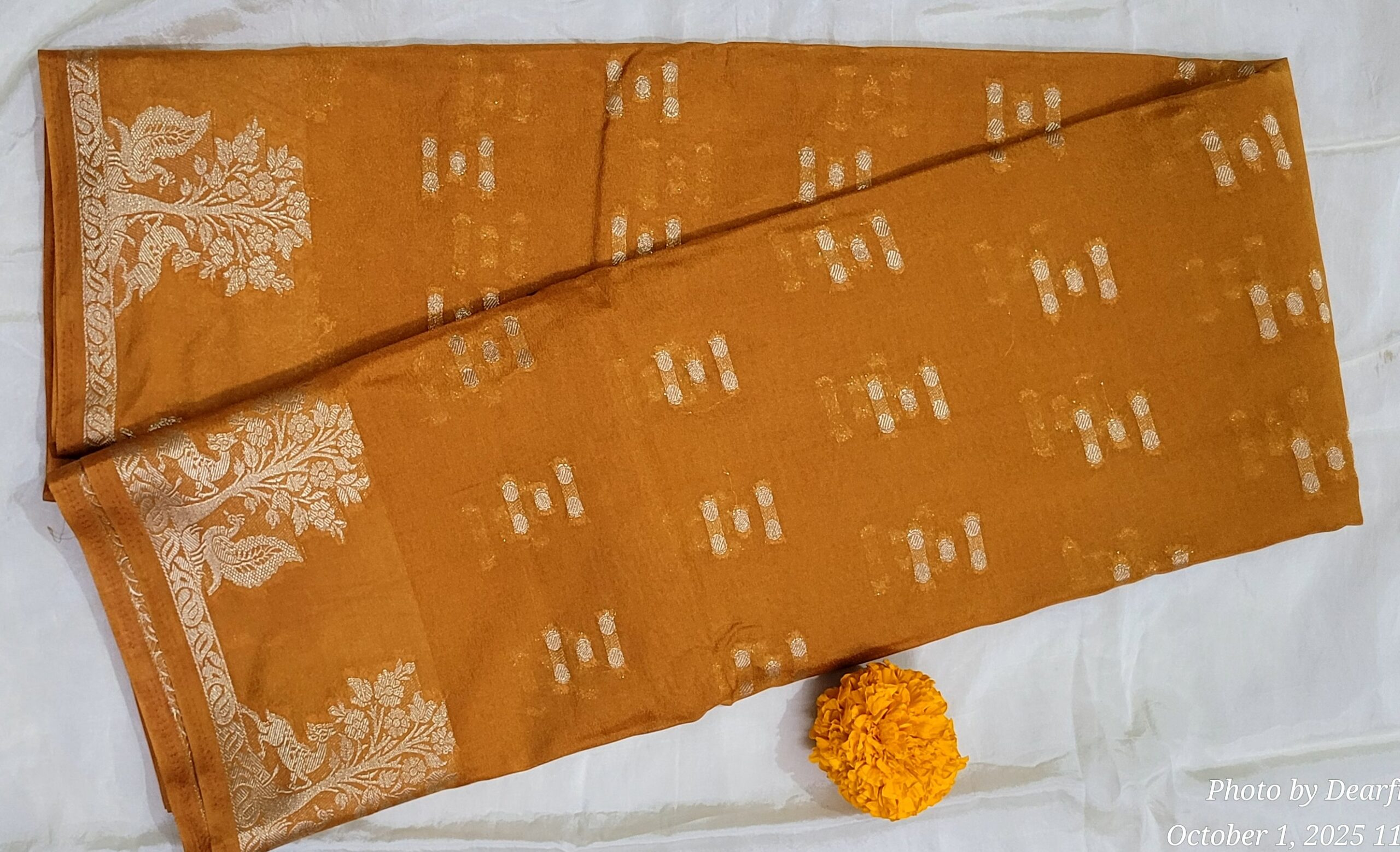 Elegant and earthy, this Banarasi silk saree in a deep mustard shade reflects traditional grace. Adorned with fine gold zari detailing and a classic peacock-and-tree border, it blends sophistication with heritage. The lightweight silk drapes beautifully, making it perfect for festive wear and cultural events.