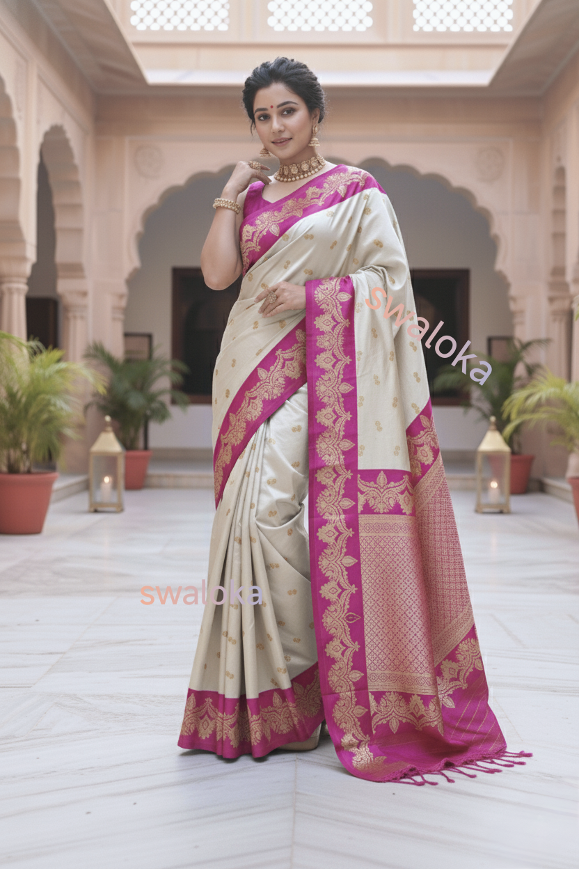 Discover elegance with this Swaloka Exclusive Ivory Soft Silk Saree, beautifully complemented by a rich Royal Magenta Zari Border. Crafted with premium satin silk for a smooth, glossy drape, this saree features delicate gold zari buttas and a grand traditional pallu, making it perfect for weddings, festive functions, and cultural celebrations.