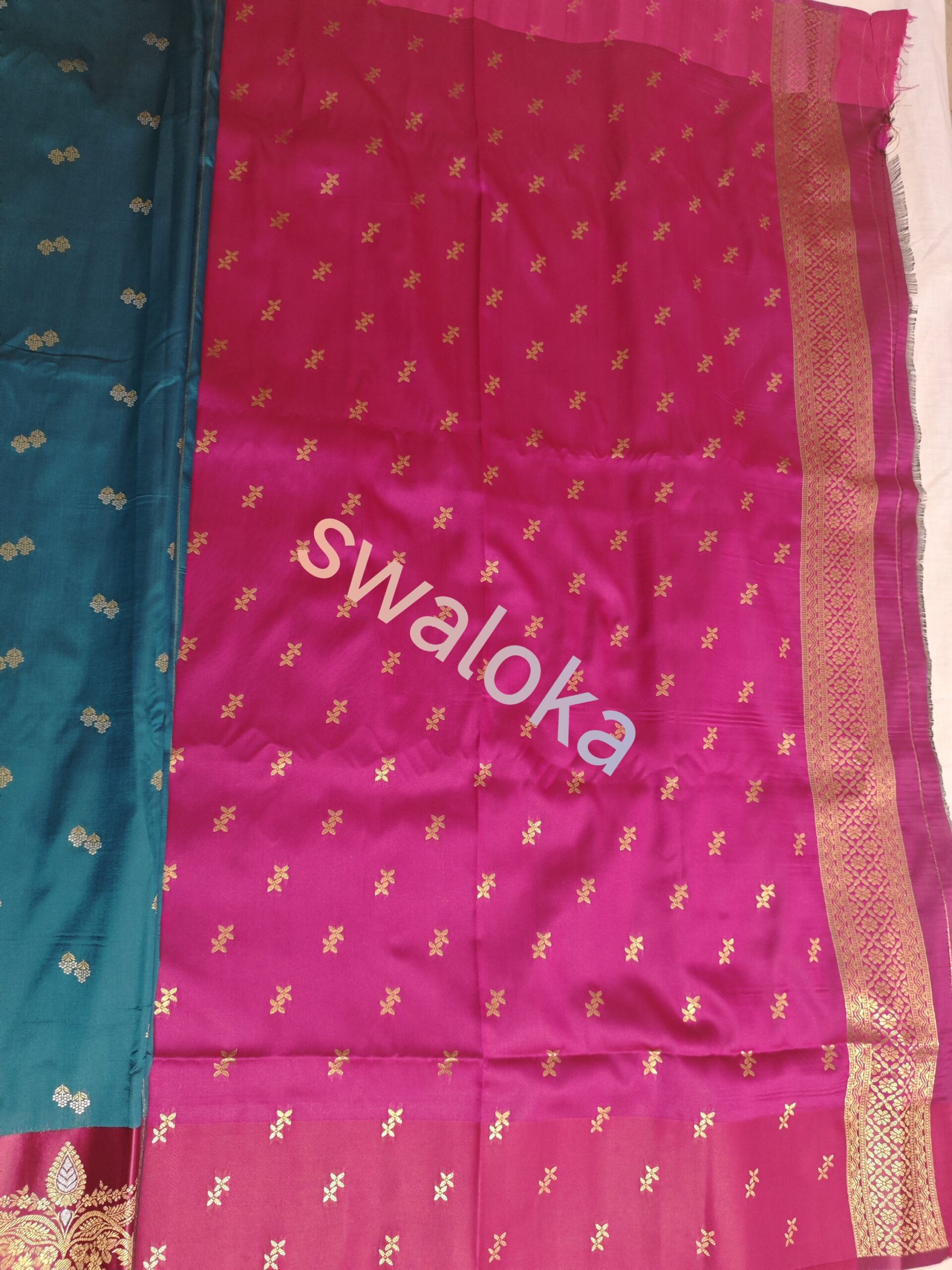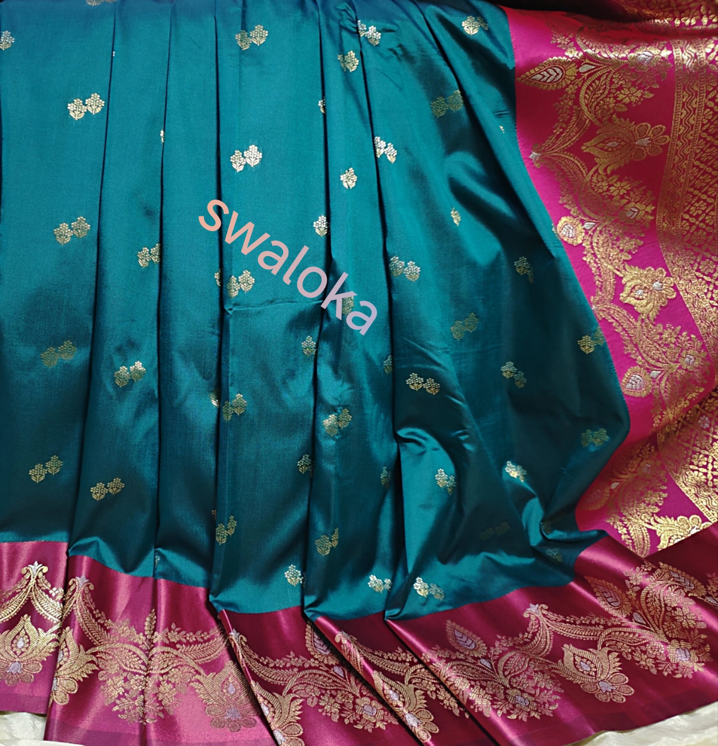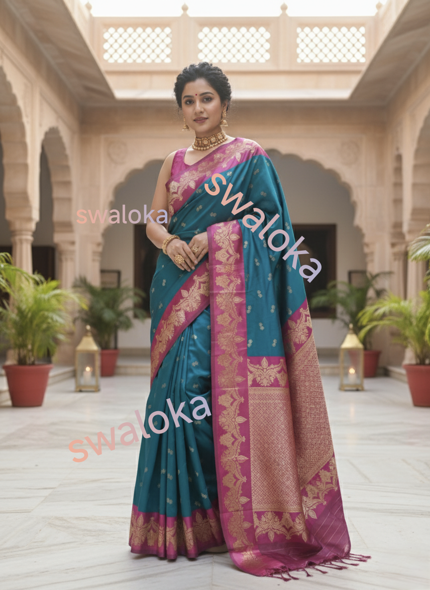 Discover elegance with this Swaloka Exclusive Bondi Blue Soft Silk Saree, beautifully paired with a rich Magenta Zari Border. Crafted with premium satin silk for a smooth, glossy drape, this saree features delicate gold zari motifs and a grand pallu—perfect for weddings, festive functions, and traditional celebrations. A luxurious choice designed by Swaloka for women who prefer lightweight yet royal silk sarees.