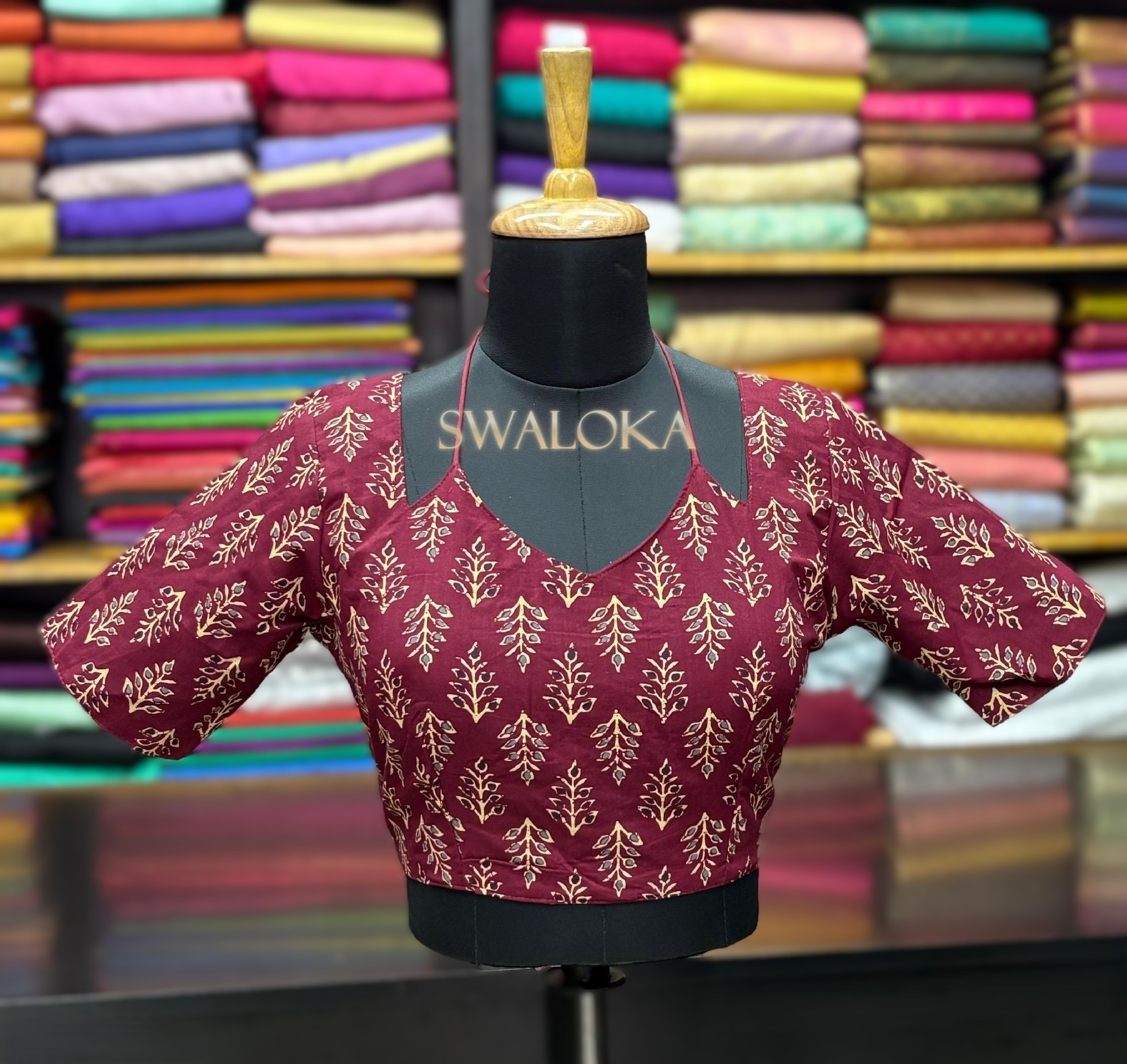 Deep Maroon Pure Ajrakh Print Cotton Padded Blouse - Back Open StyleDeep Maroon Pure Ajrakh Print Cotton Padded Blouse – Back Open Style