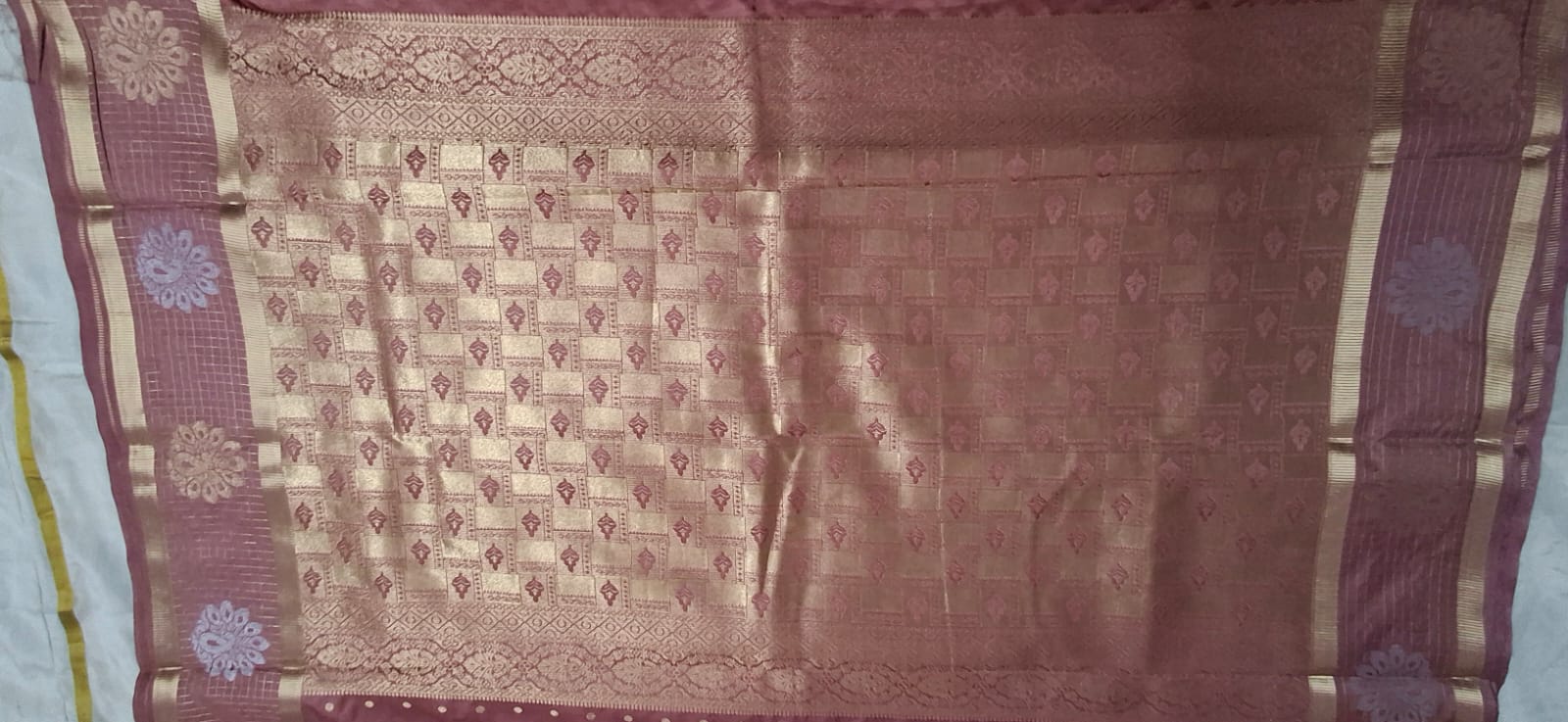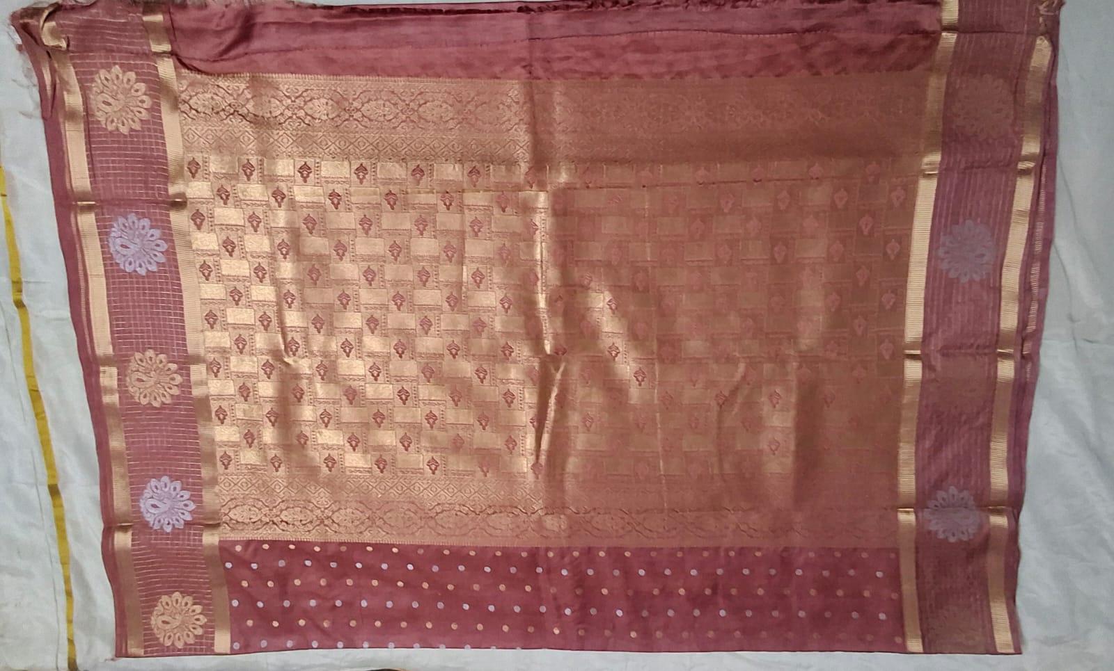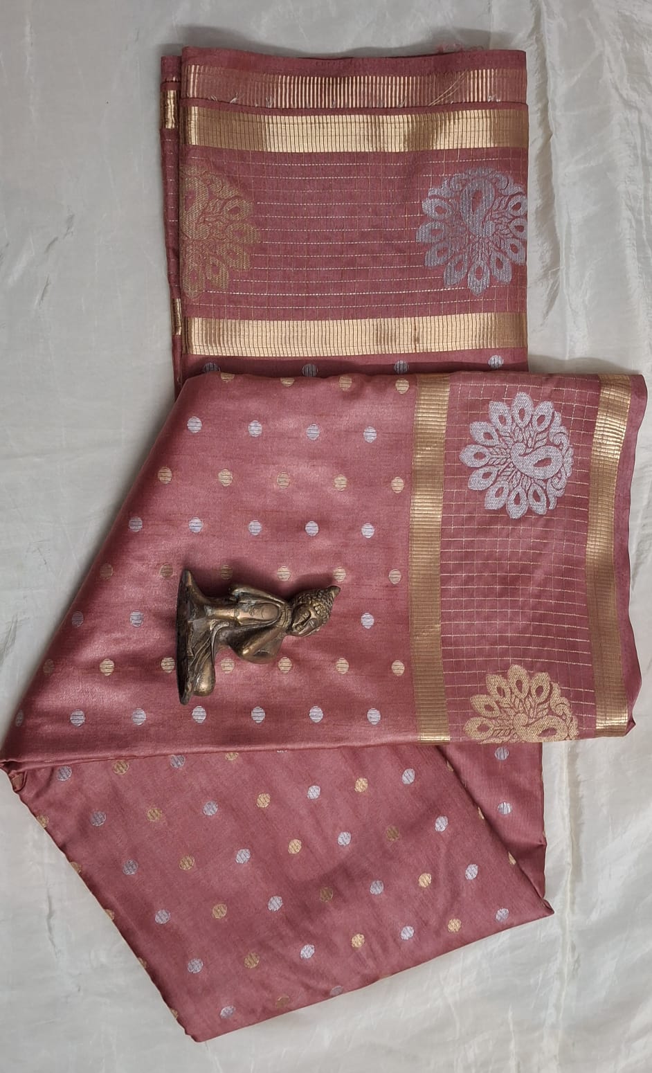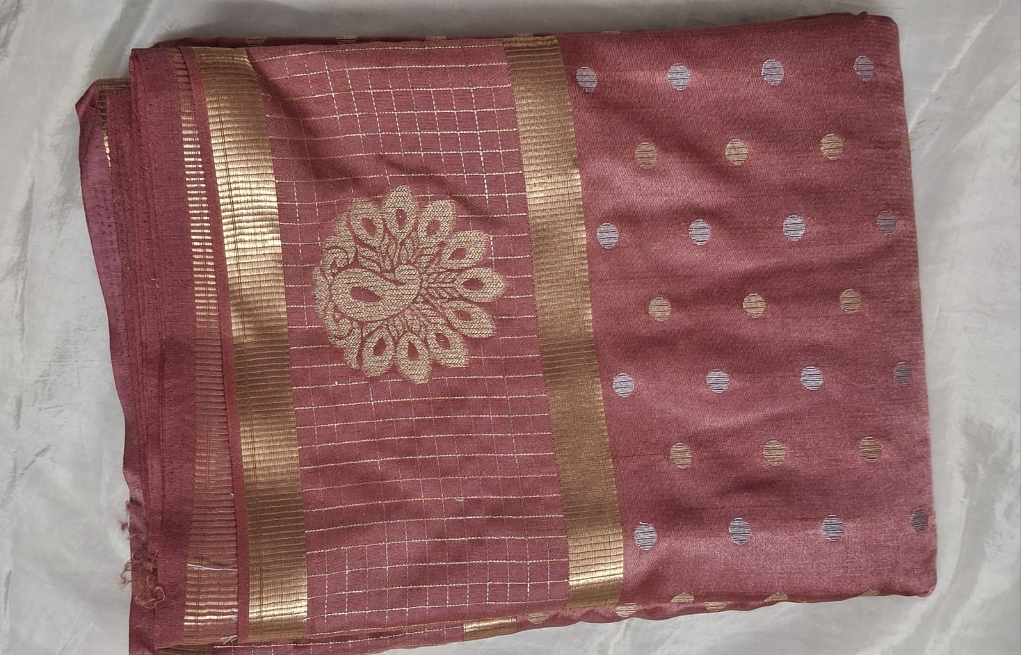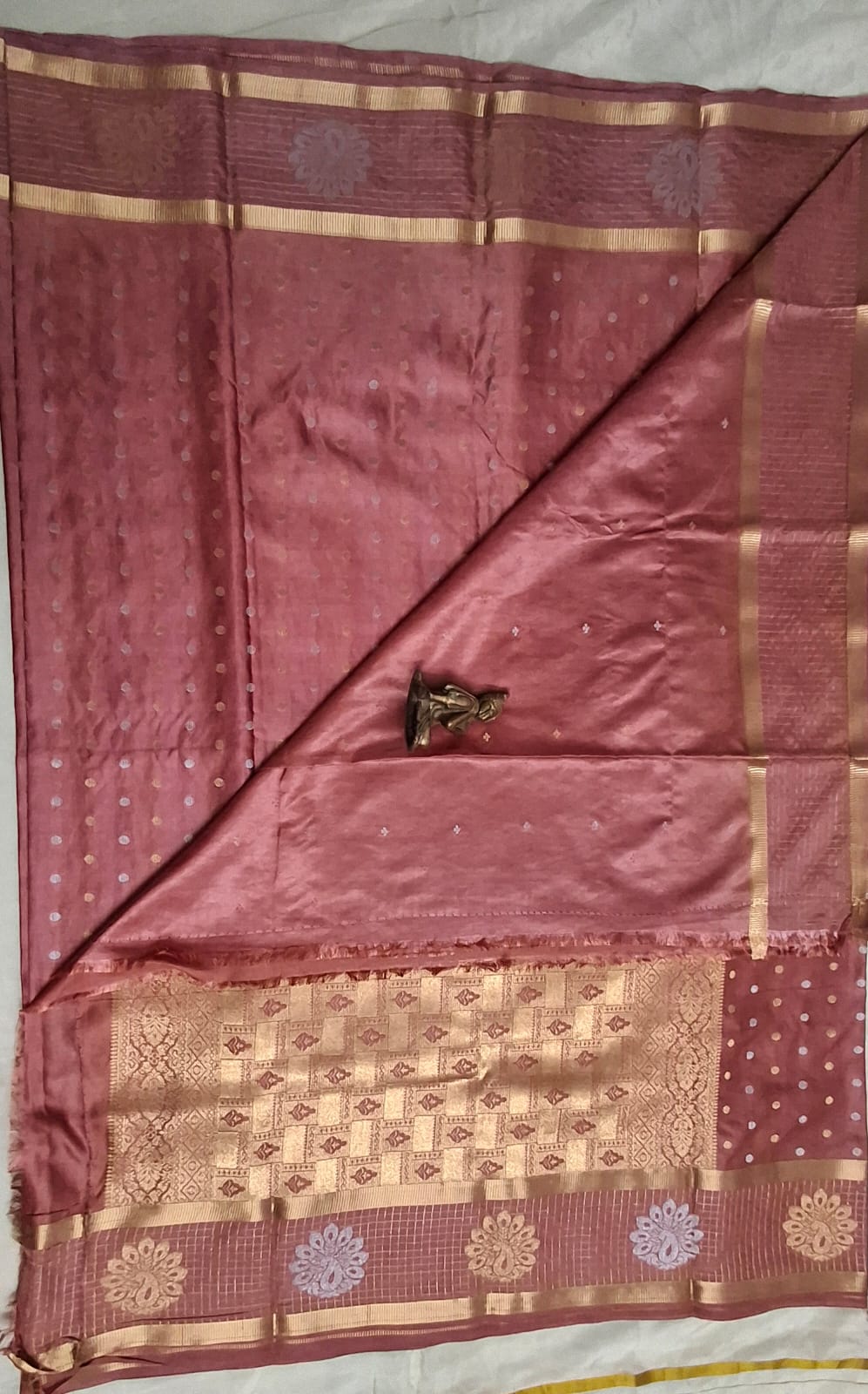 This is a beautiful, rich-looking saree in a sophisticated dusty rose or mauve color. The fabric has a subtle sheen characteristic of silk or silk blend materials, suggesting elegance and a smooth drape.