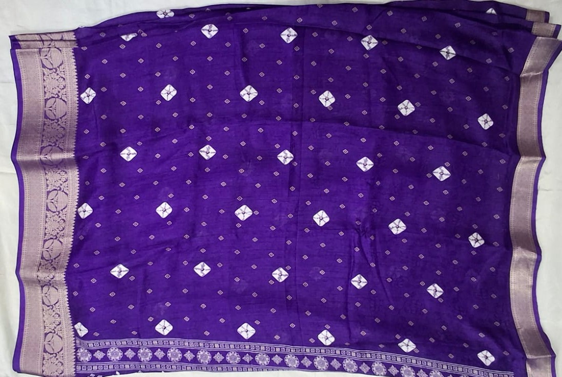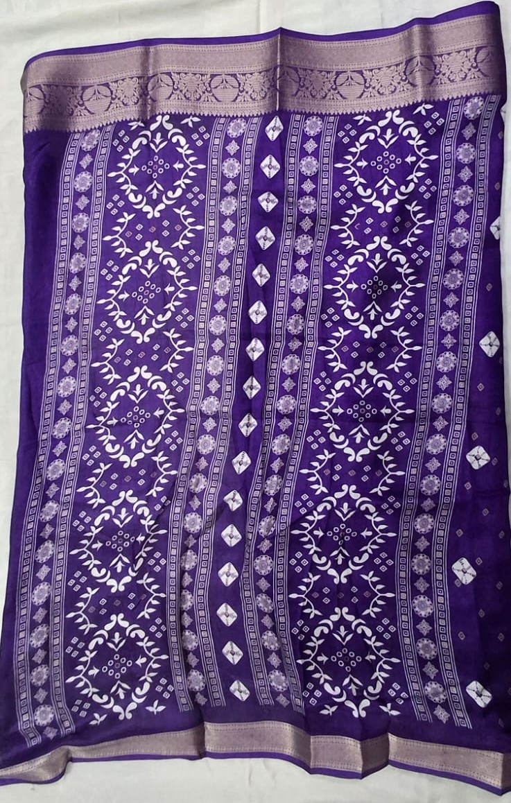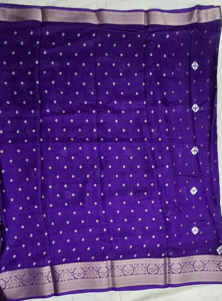 The saree is dyed in a stunning, deep Royal Purple hue and features an exquisite all-over digital print that masterfully mimics the intricate style of traditional Bandhani (tie-dye) work. The tiny, perfectly placed white diamond and square motifs create a delicate yet vibrant contrast against the deep background.