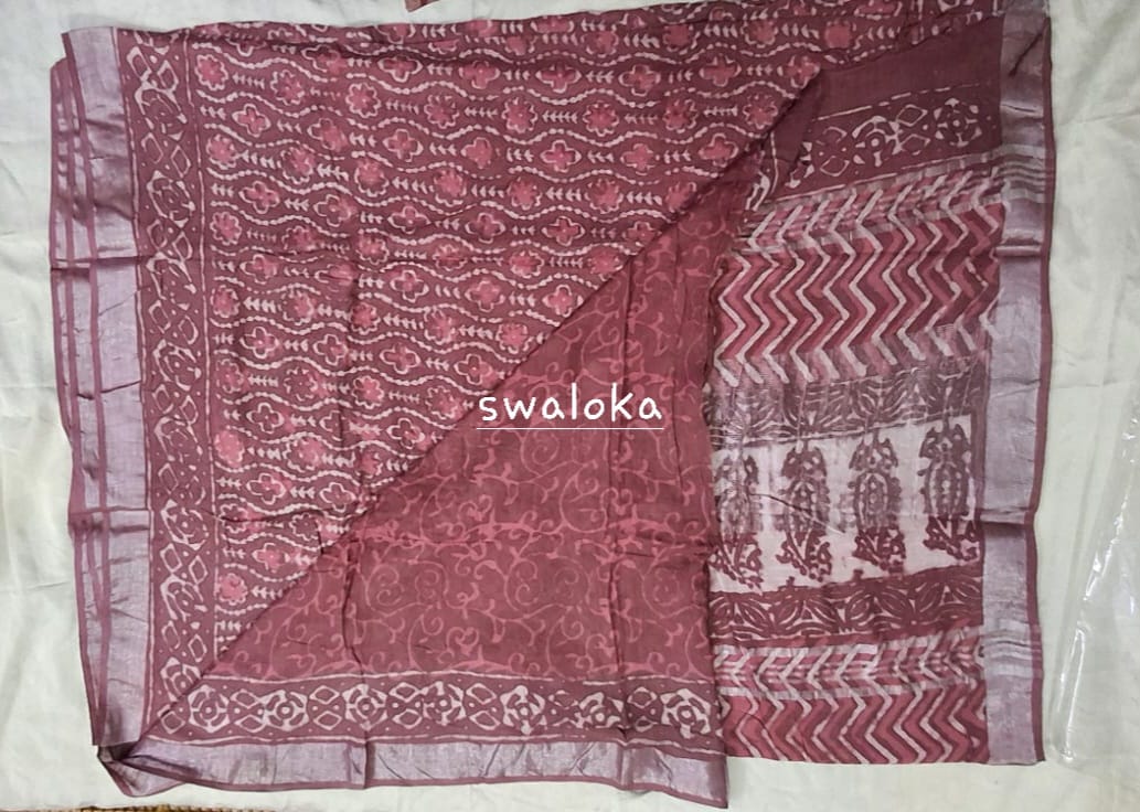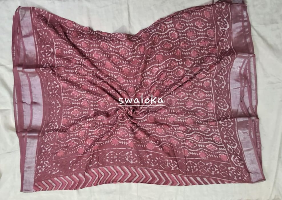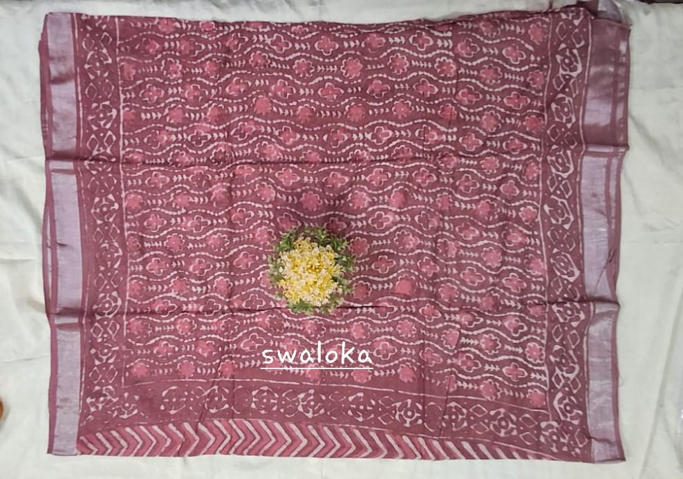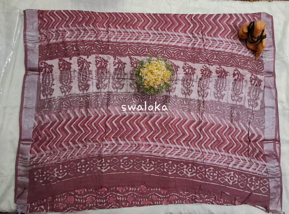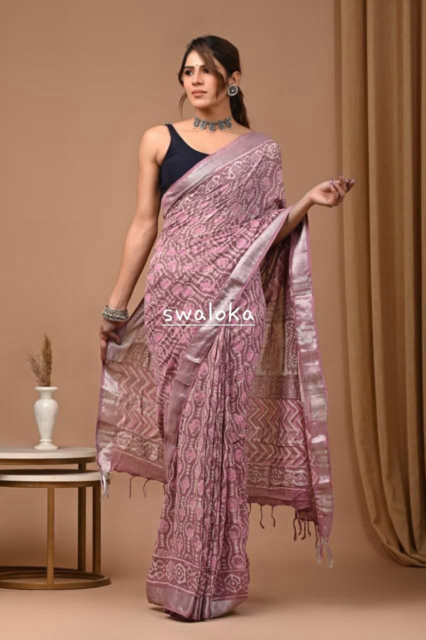 Elegant Mauve Bagru Hand Block Print Linen Cotton Saree with Blouse PieceElegant Mauve Bagru Hand Block Print Linen Cotton Saree with Blouse Piece