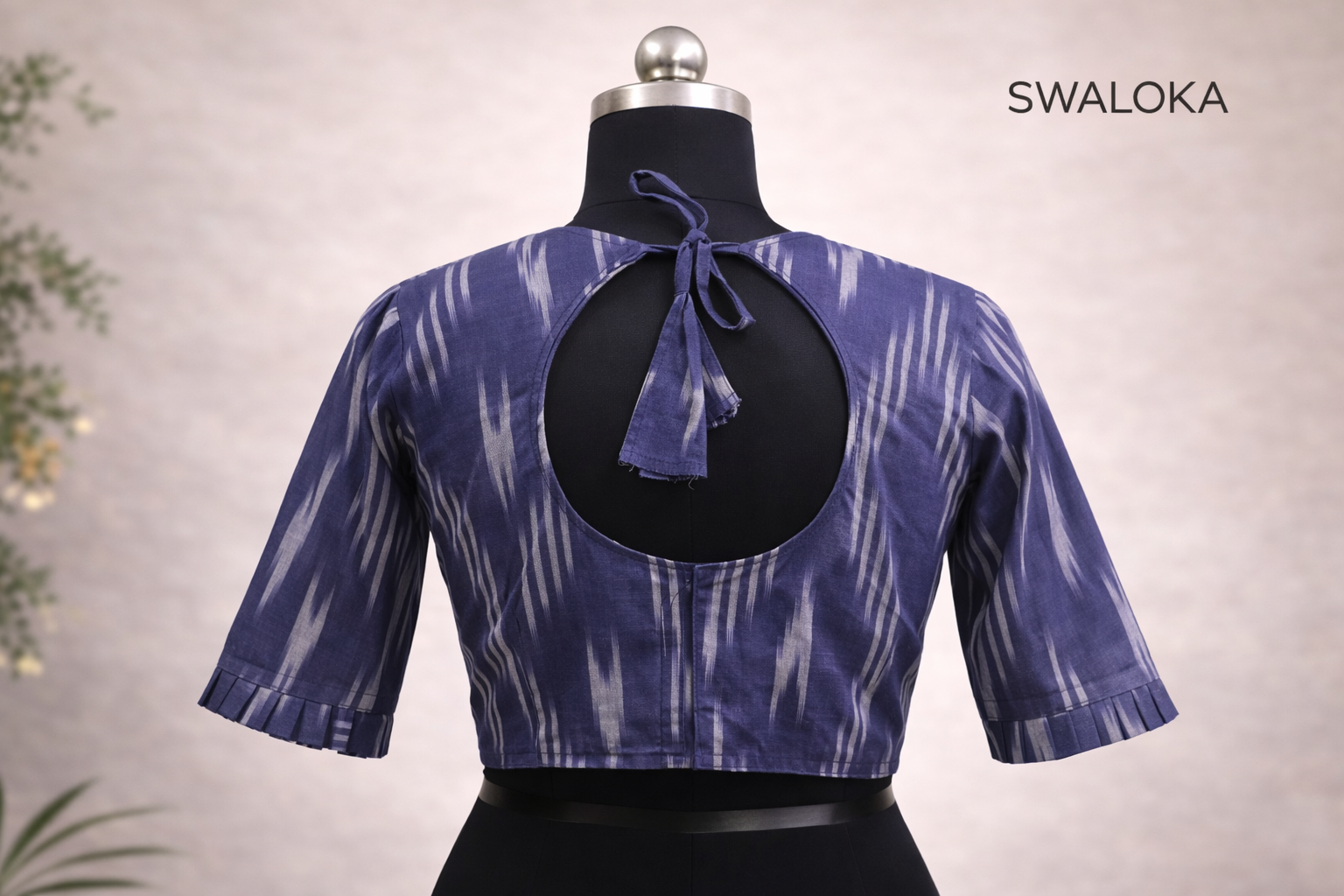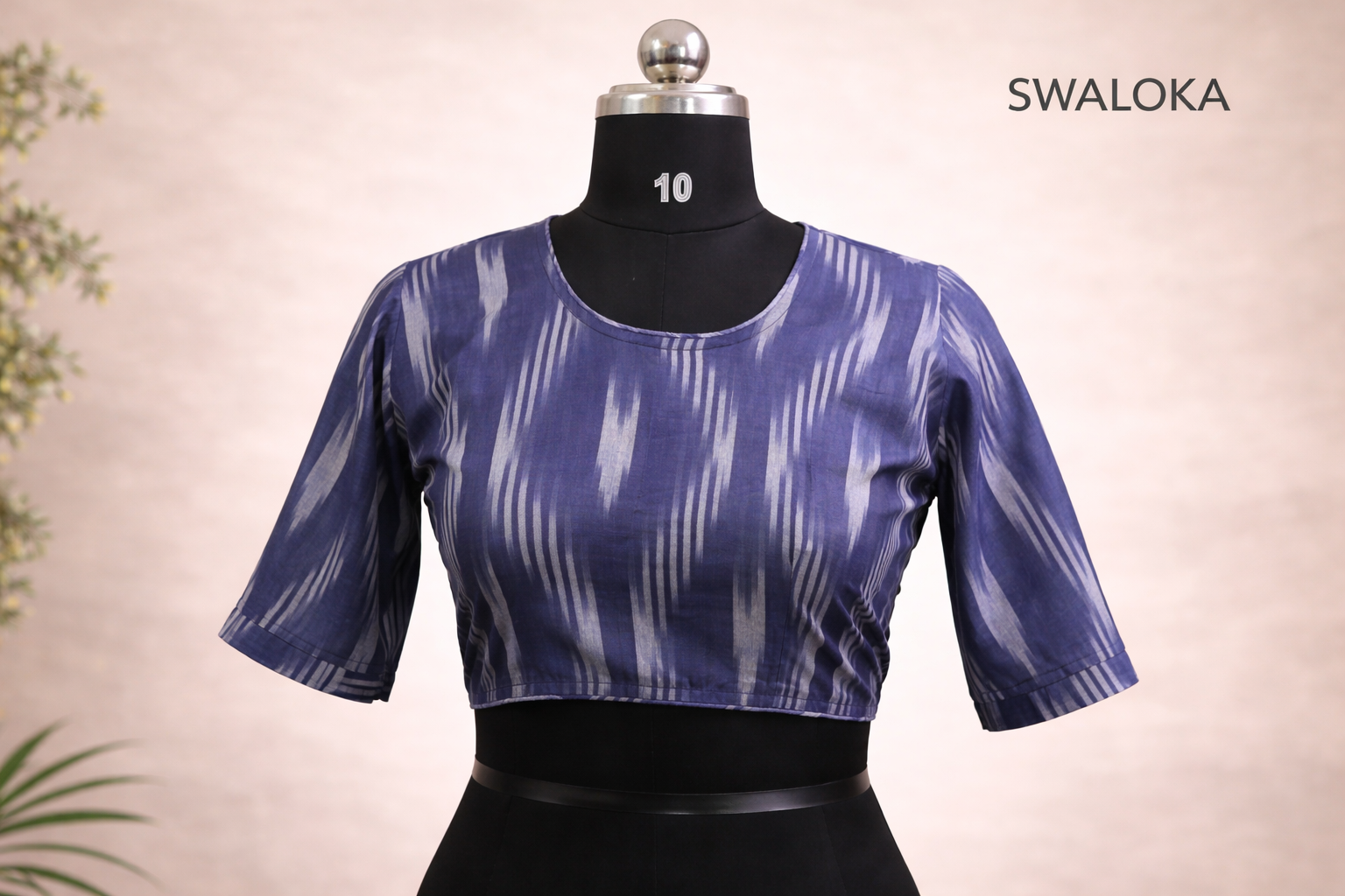 Elegant ikat print blouse made from 100% pure breathable cotton. Designed without padding and lining for a soft, lightweight feel. Features a classic round neck with piping in the front and a deep round back with tie-up detail. Elbow-length sleeves with subtle pleats add a graceful traditional touch. Perfect to pair with cotton, silk, or linen sarees for a smart ethnic look.