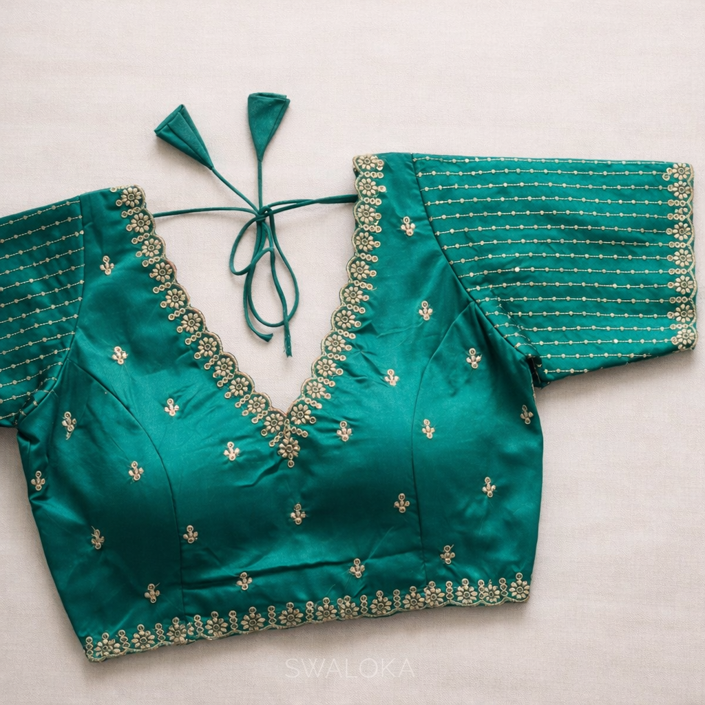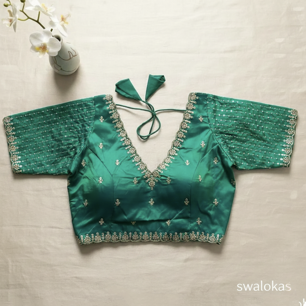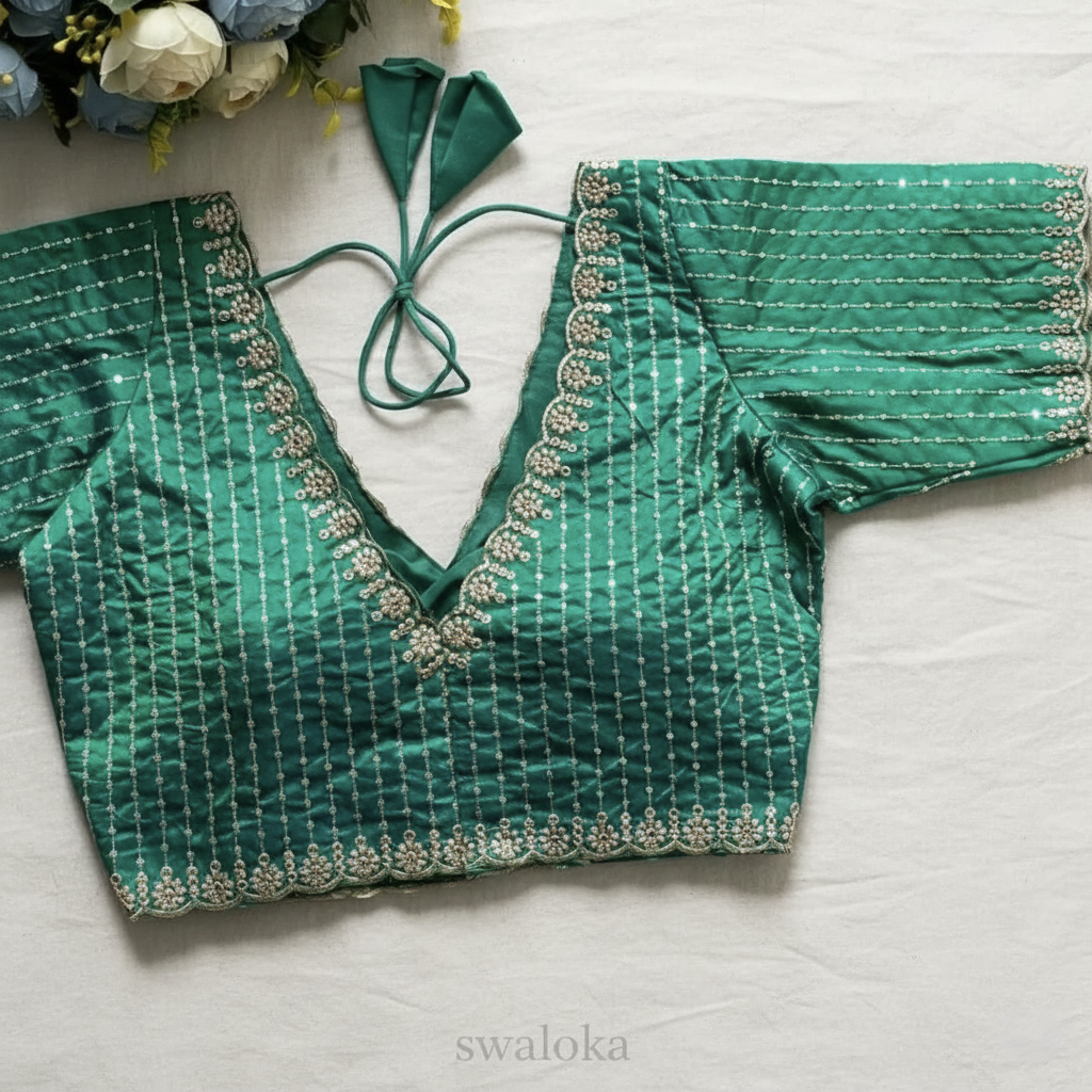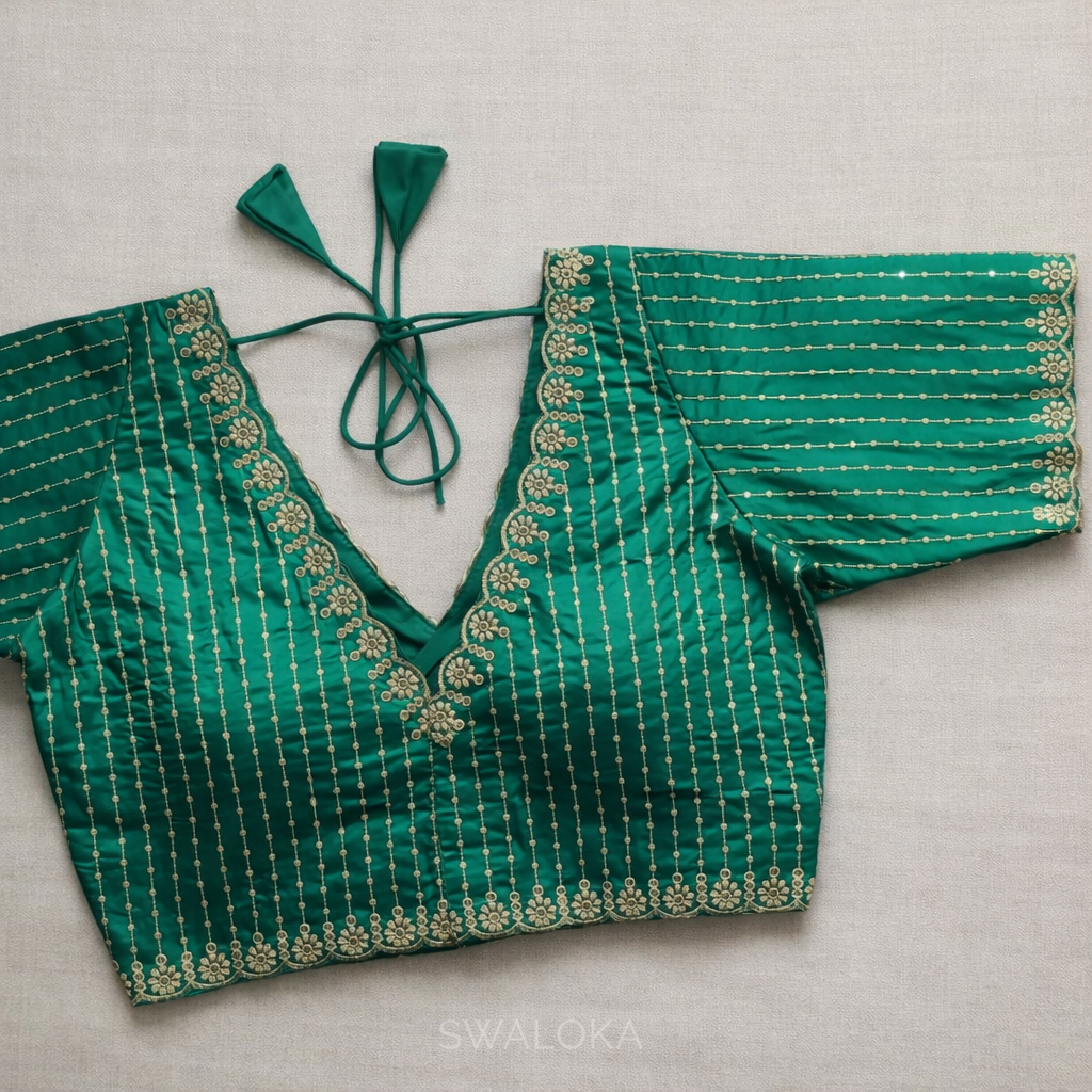 Add a touch of royalty to your ethnic wardrobe with this Emerald Green Banarasi Silk blouse. It features a flattering deep V-neckline and elegant elbow-length sleeves, accented by shimmering vertical sequin stripes. The design is elevated by intricate floral Zari embroidery and delicate scalloped edges along the borders. Finished with a stylish back dori and tassels, this padded blouse is a perfect blend of traditional craftsmanship and modern style.