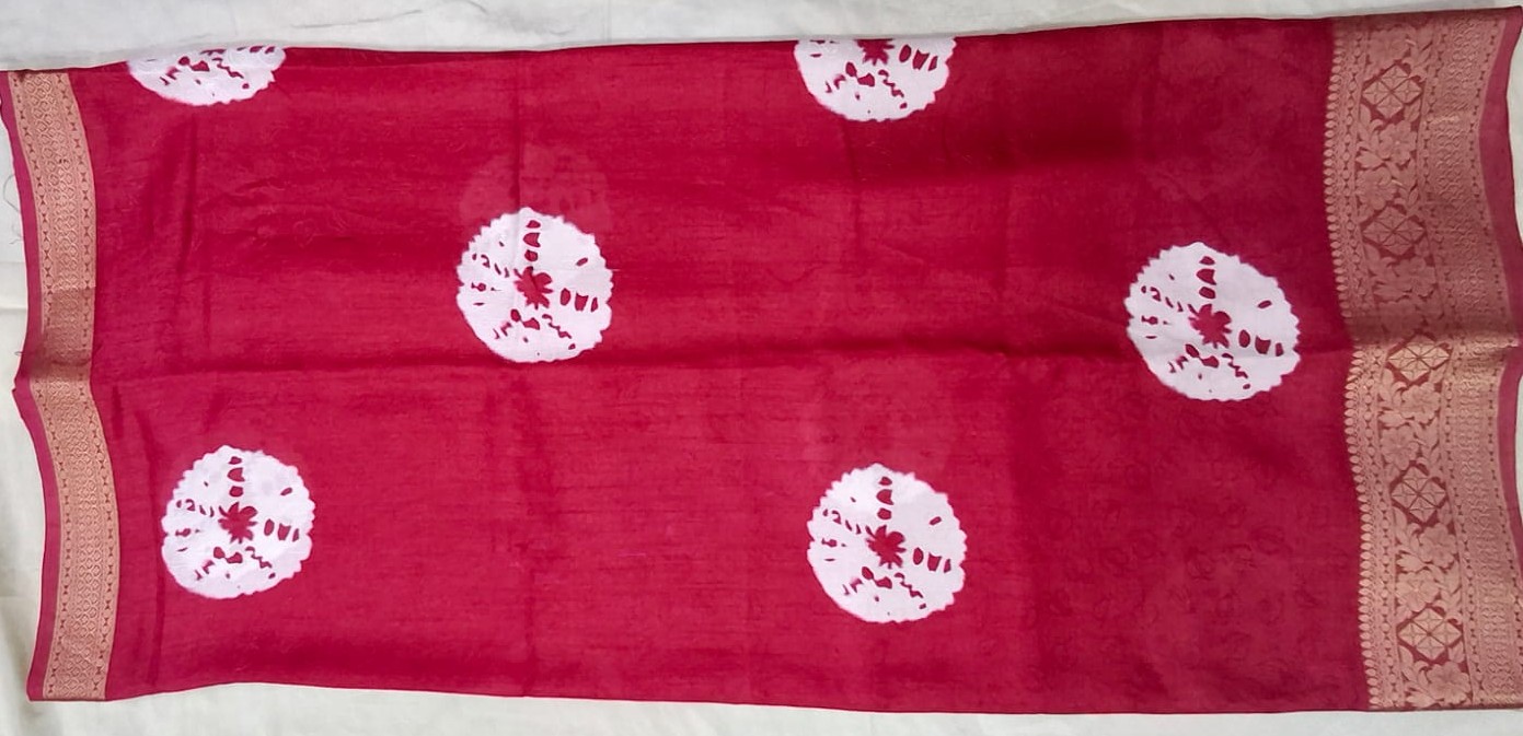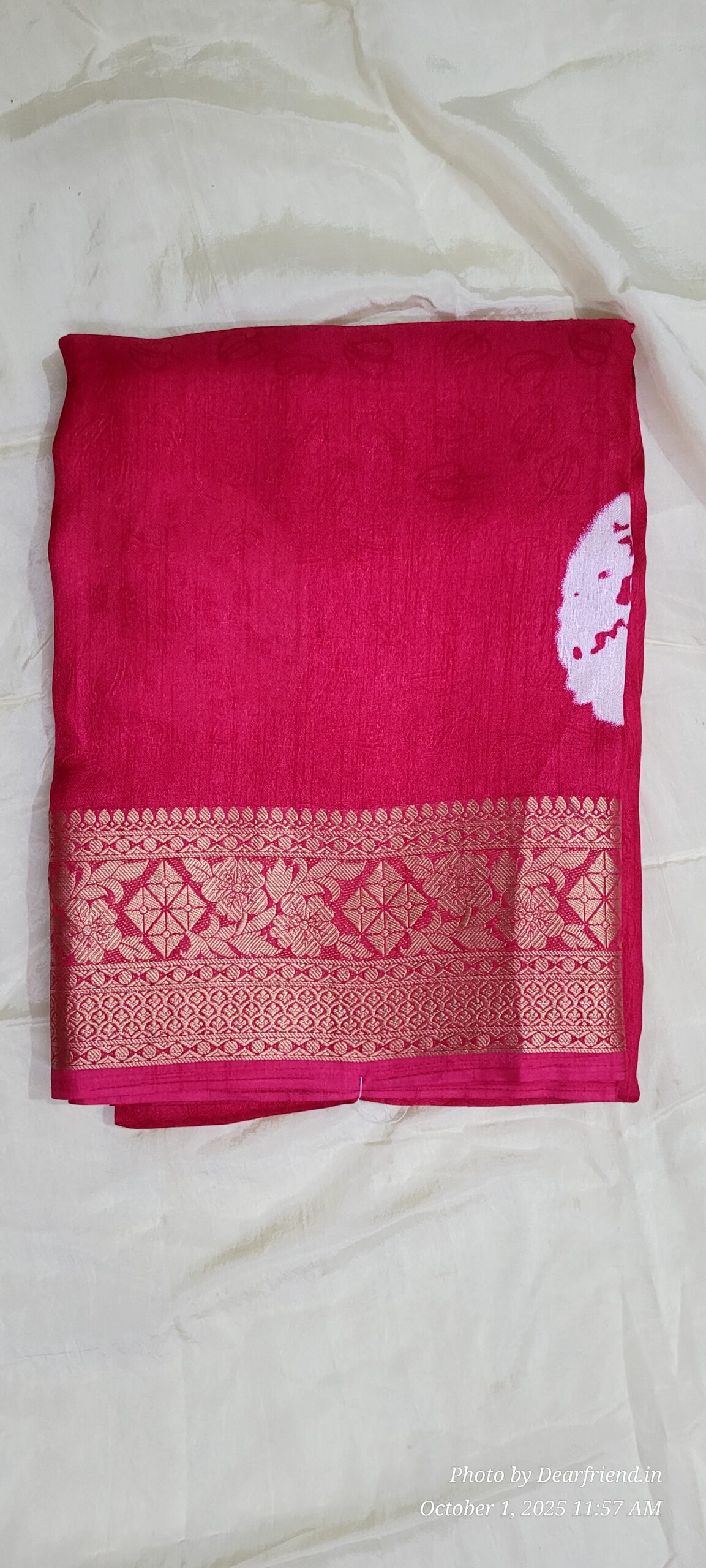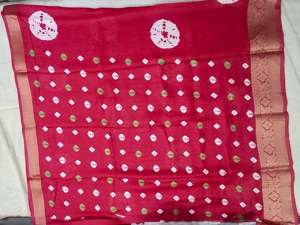 The body glows in a rich Rani Pink/Deep Red, adorned with the charming Bandhani-inspired white motifs and small green/white dots scattered throughout.