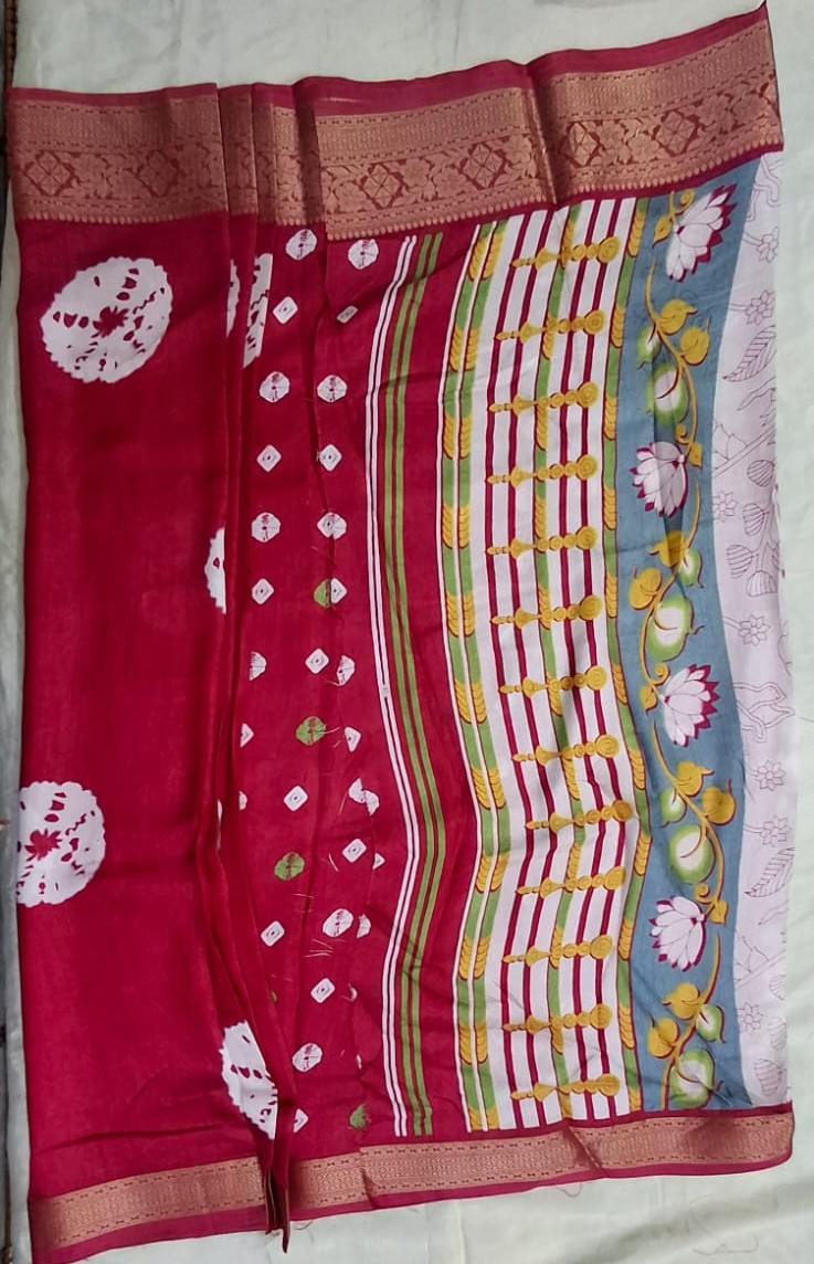 Exclusive All-Over Bandhani-Inspired Print. Gold Zari Woven Border. Multi-panelled contrast section featuring vertical stripes and hand-painted style floral/vine motifs (blue/yellow/white).