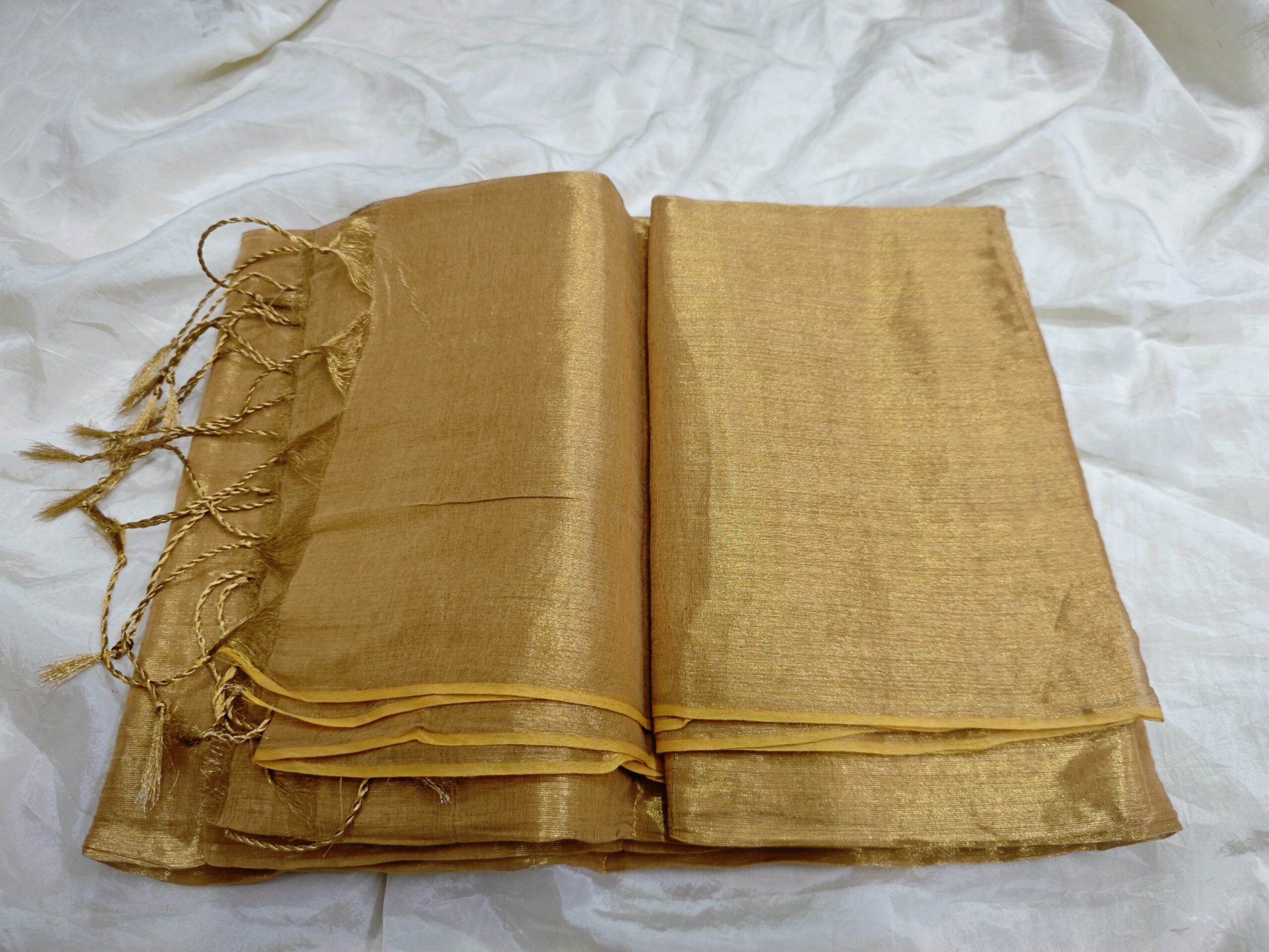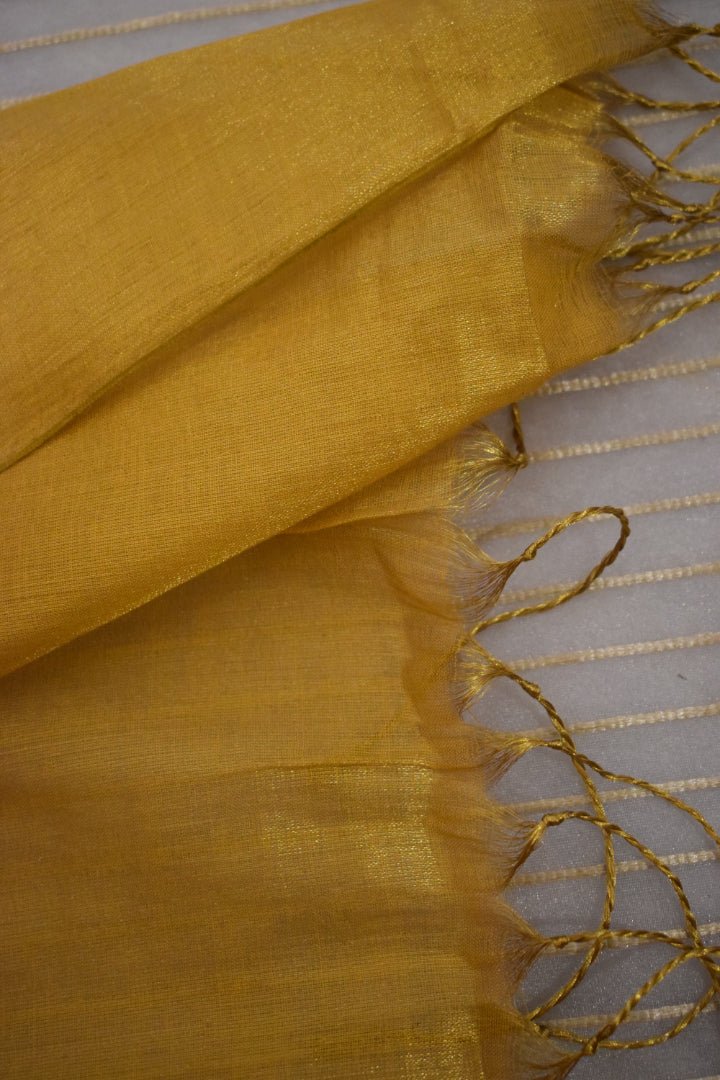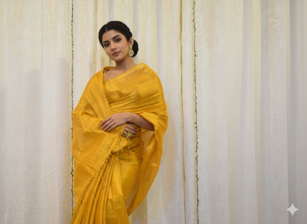 This Golden Mustard Tissue Saree exudes warmth and richness with its glowing gold undertone and earthy mustard base. A perfect blend of traditional charm and contemporary elegance, ideal for festive wear, temple visits, weddings, and ethnic styling.