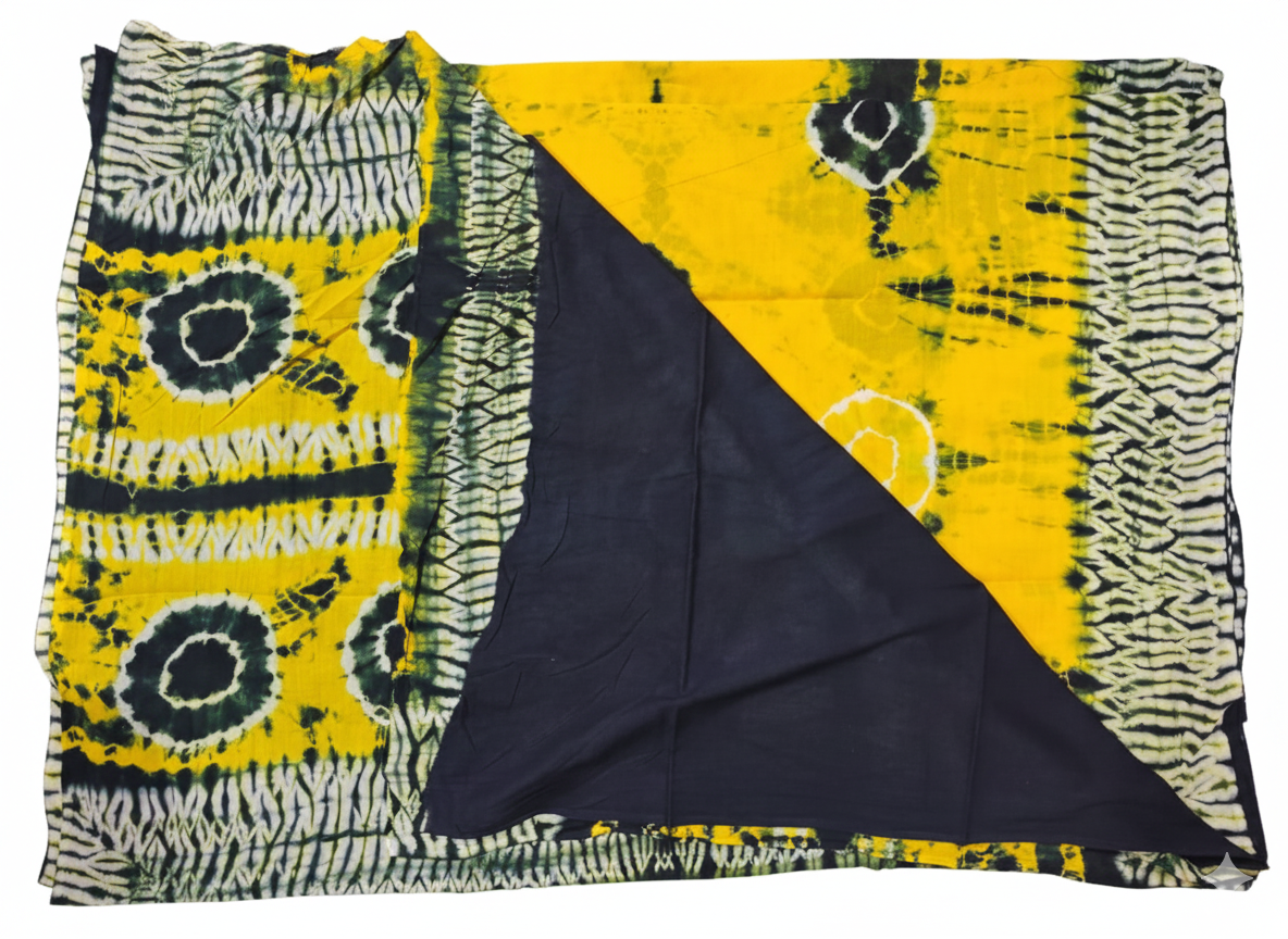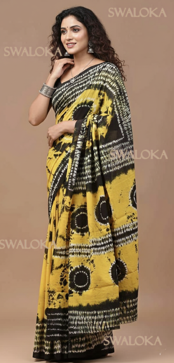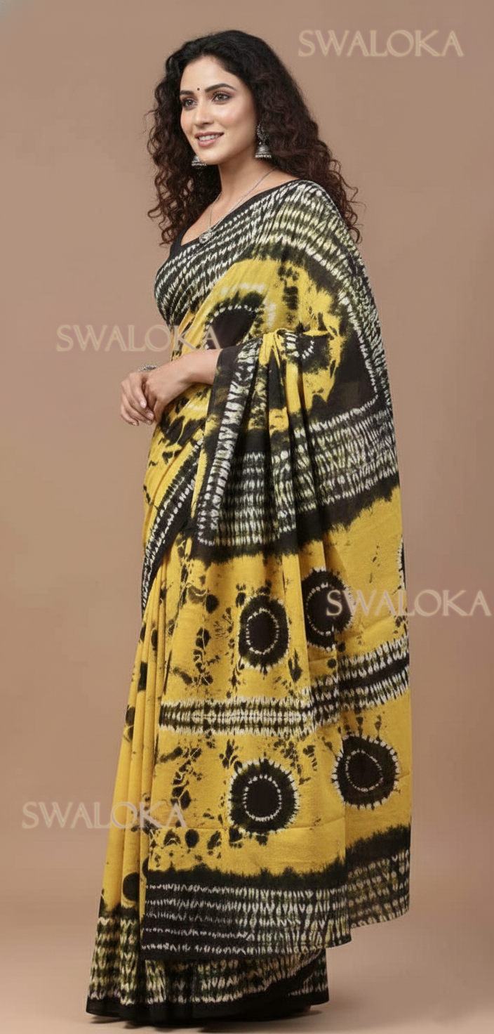 Unlike standard prints, every motif on this saree was first hand-sewn and tightly cinched by artisans to resist the dye, resulting in organic, ethereal patterns that can never be replicated by a machine. The vibrant mustard base contrasted with deep charcoal black creates a sophisticated look suitable for both professional settings and festive gatherings.