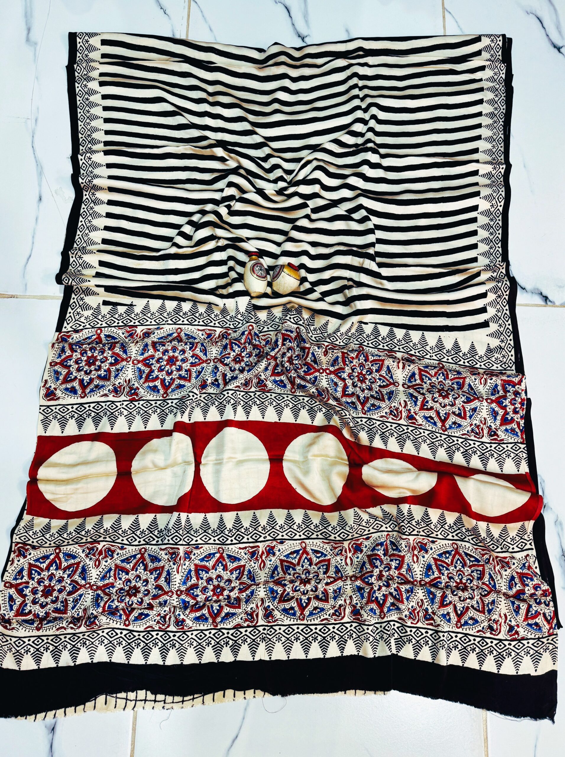 Natural Color Ajrakh Modal Silk Saree – Black Stripe