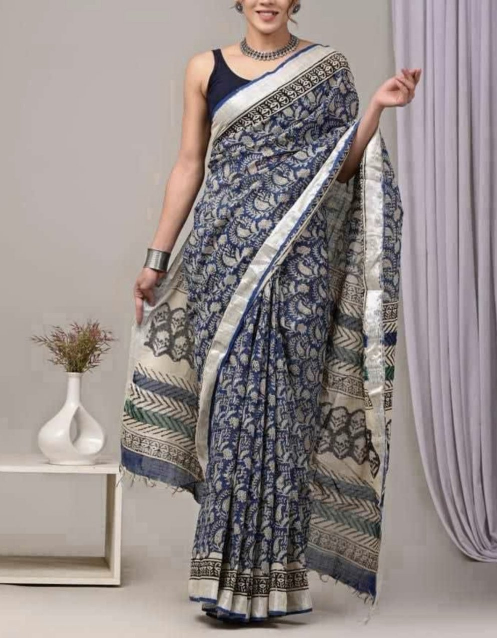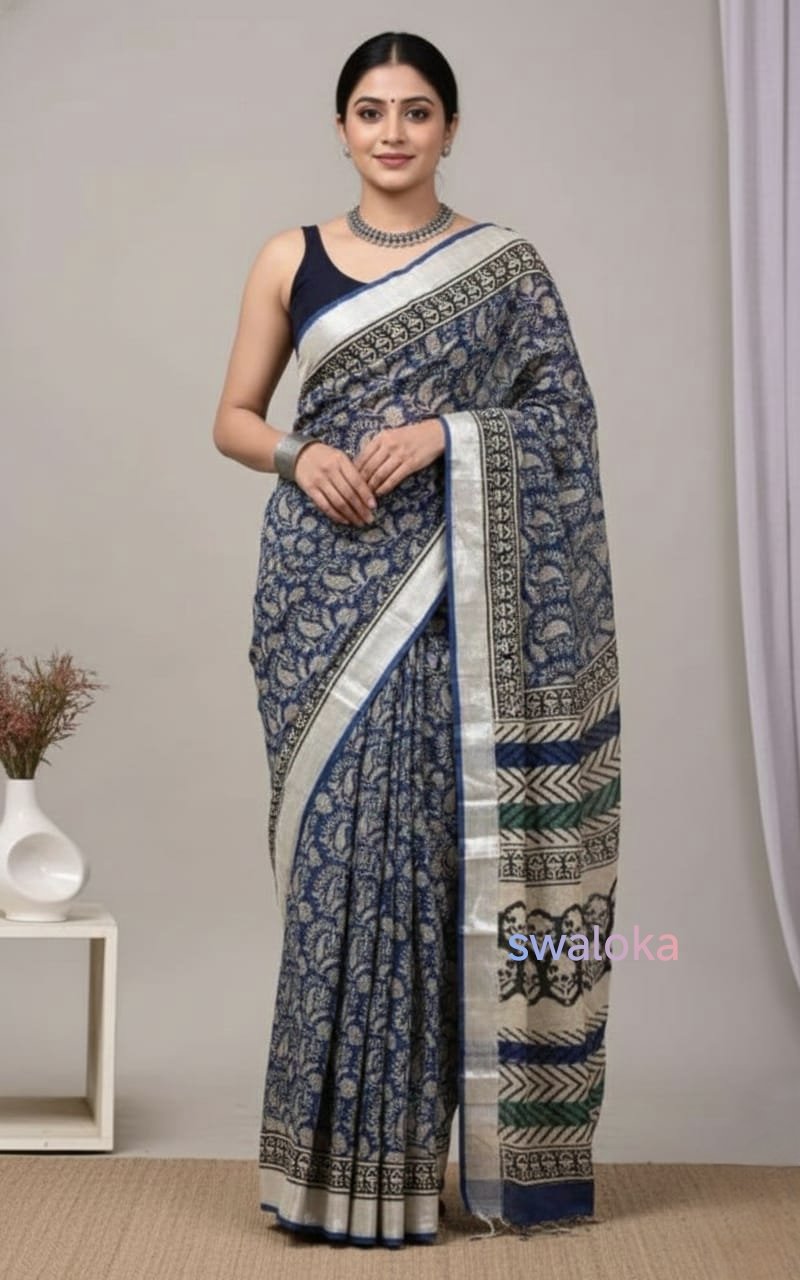 Embrace the timeless beauty and unmatched comfort of this authentic Bagru hand block print saree, a true celebration of traditional Rajasthani craftsmanship featuring intricate floral and paisley patterns meticulously printed using natural colors on a premium linen cotton blend fabric that is 100% pure and authentic; this saree offers superb breathability and drape, highlighted by an elegant border incorporating a sophisticated silver-toned band, and it comes complete with a matching 1-meter unstitched blouse piece, making this Indigo Blue piece perfect for festive wear or sophisticated daily elegance.