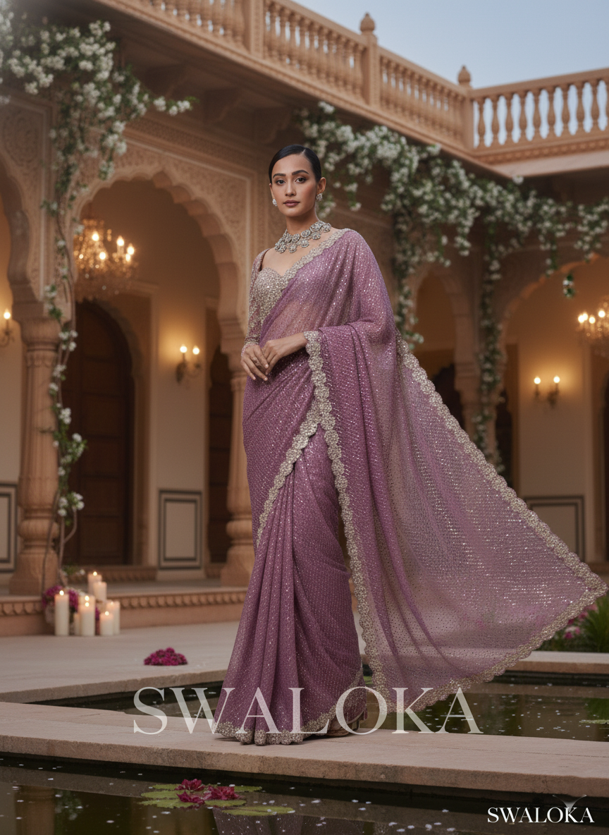 Luxe Dusty Pink Sequin & Mirror Work Georgette Saree