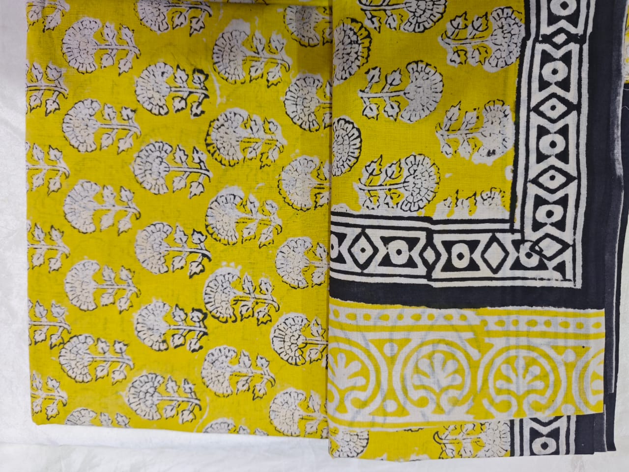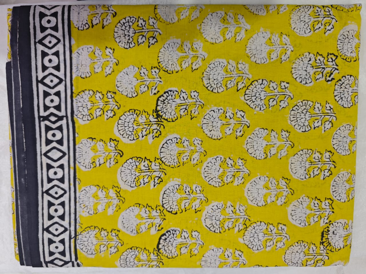 Crafted by skilled artisans using traditional Bagru hand block printing, the saree features repeating stylised floral motifs printed across a warm mustard yellow base. The motifs, rendered in ivory with subtle black outlines, create a balanced, rhythmic pattern that feels both lively and rooted.