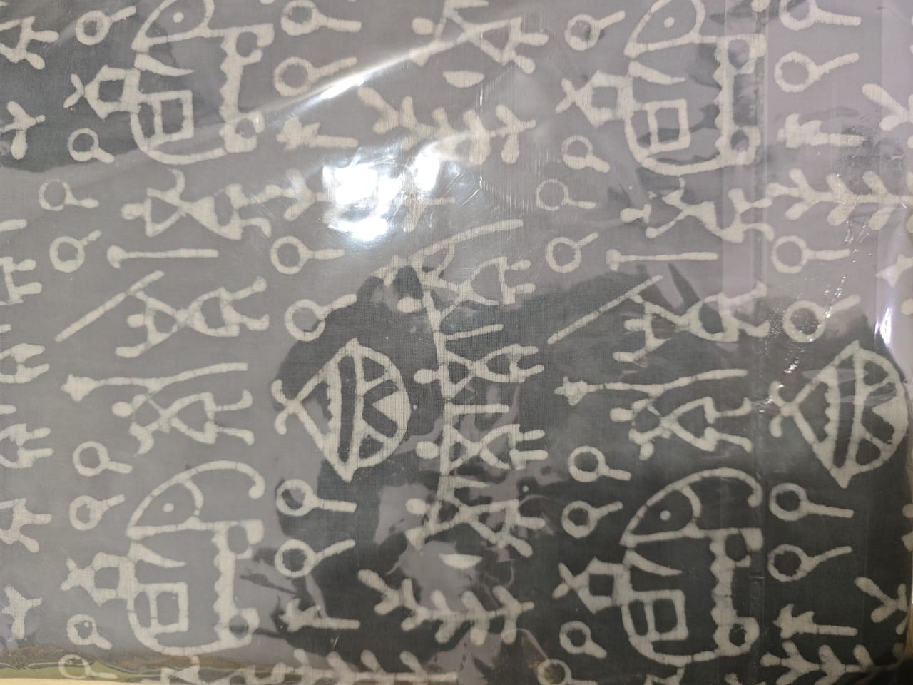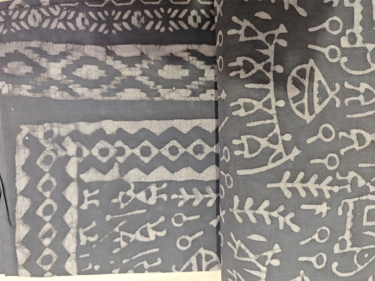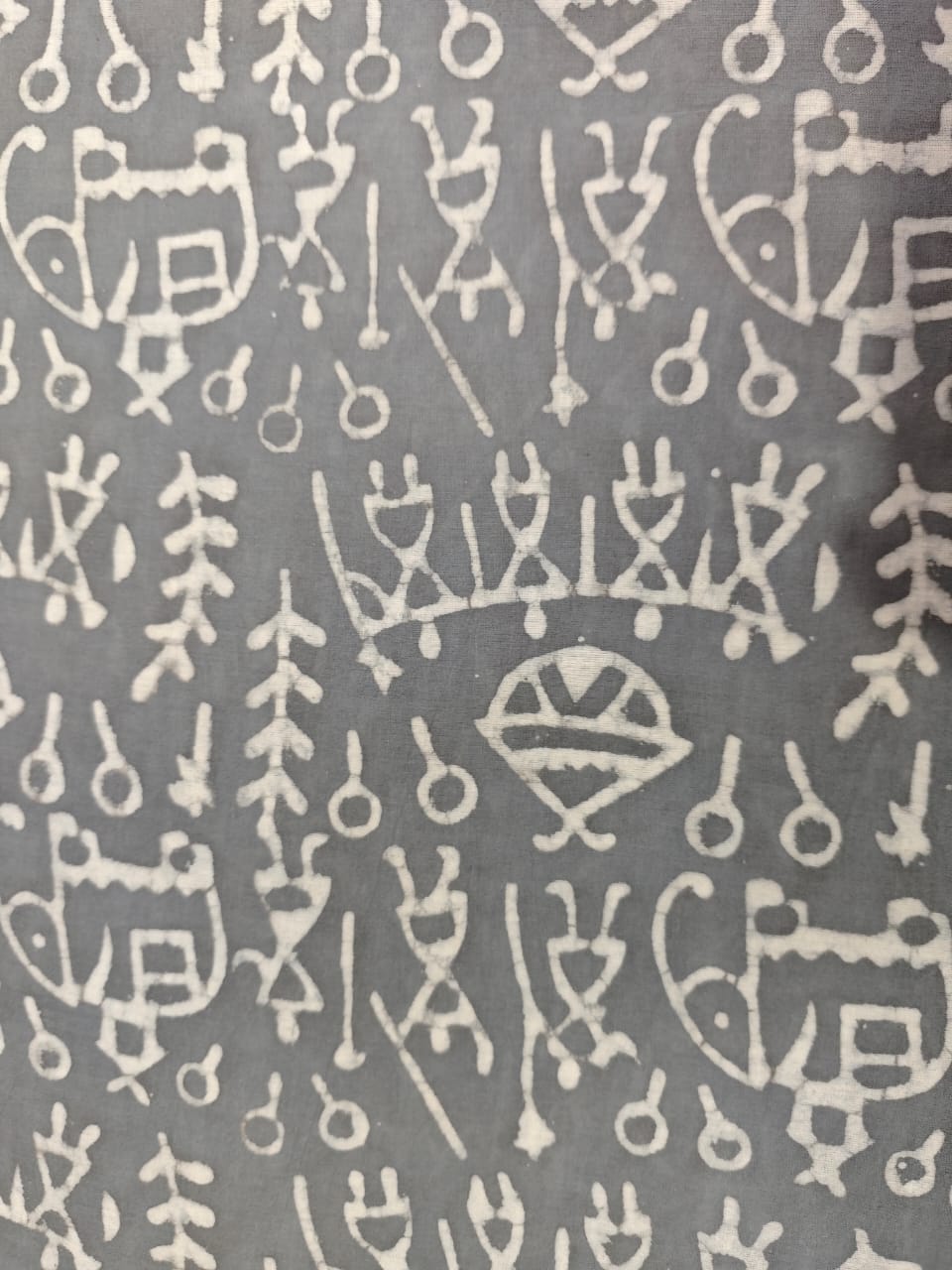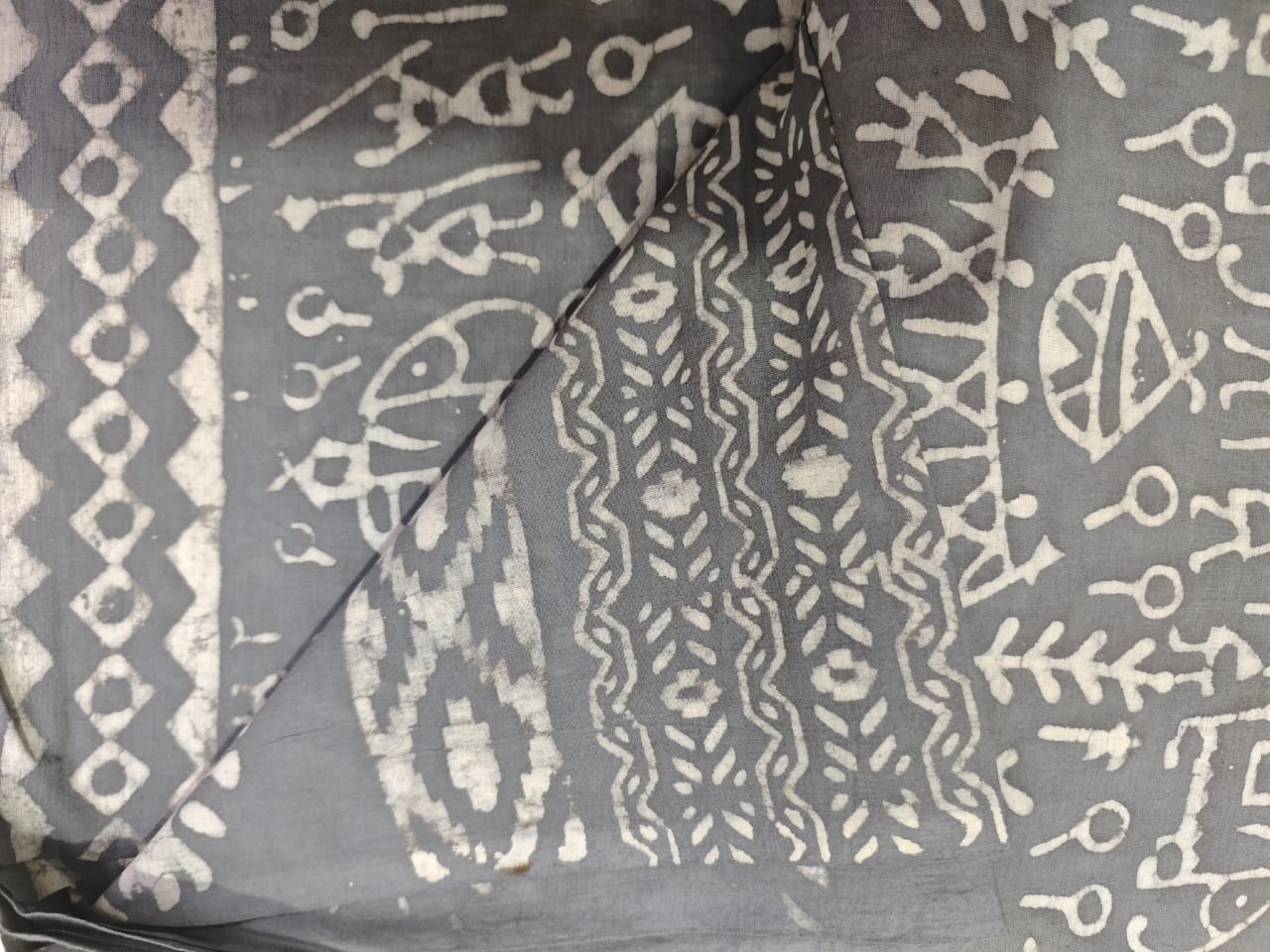Set on a soothing ash grey base, the saree features tribal and symbolic motifs printed in soft ivory tones, created using the age-old Dabu resist technique. The motifs—resembling folk symbols, flora, and rhythmic lines—form a balanced, narrative pattern that feels both contemporary and rooted in tradition.