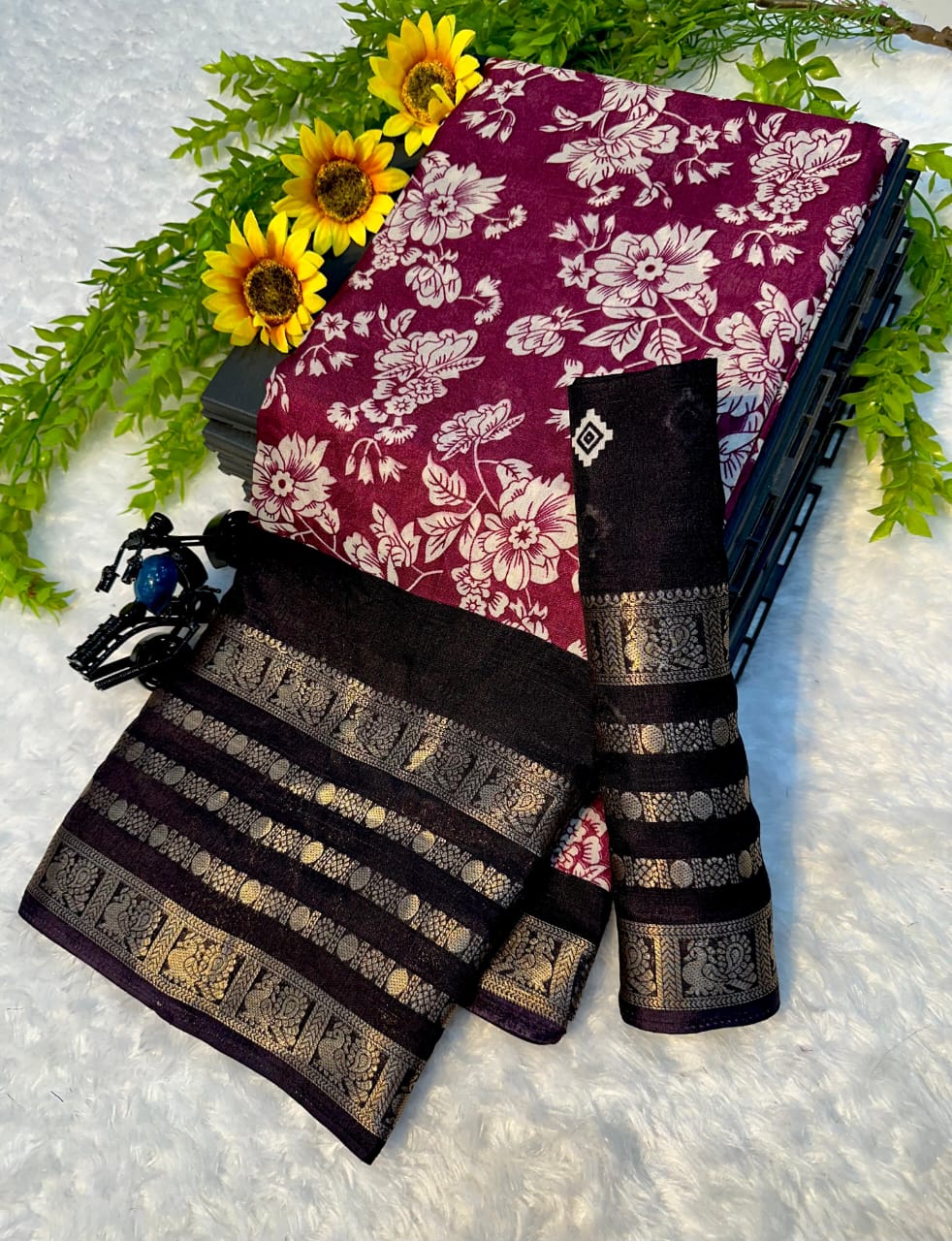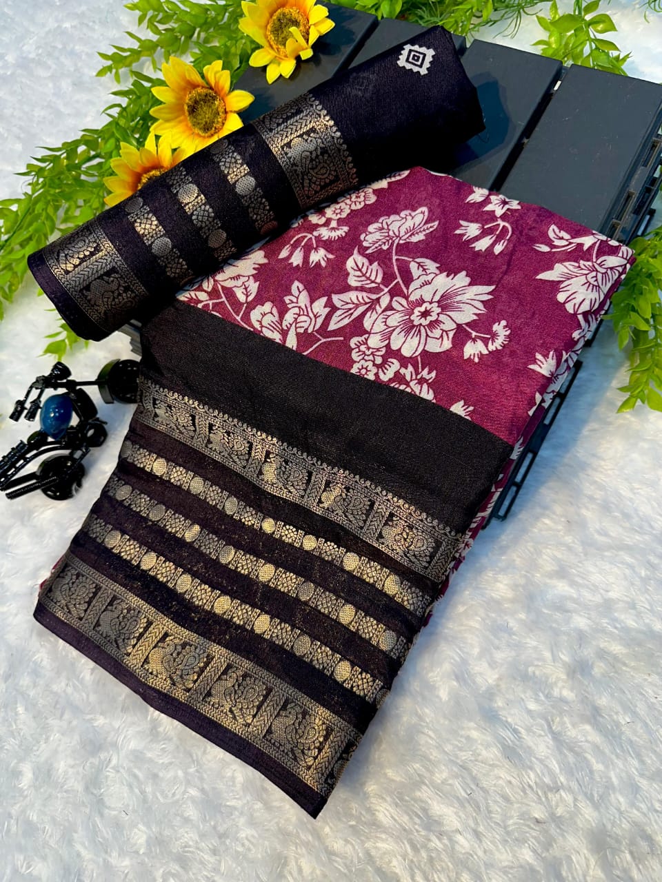 Drape yourself in the luxurious elegance of this Super Hit Premium Dola Silk Saree, a magnificent blend of contemporary design and traditional craftsmanship. The body features a fresh Pink canvas beautifully contrasted with a vibrant white floral print, offering a graceful, flowing drape.