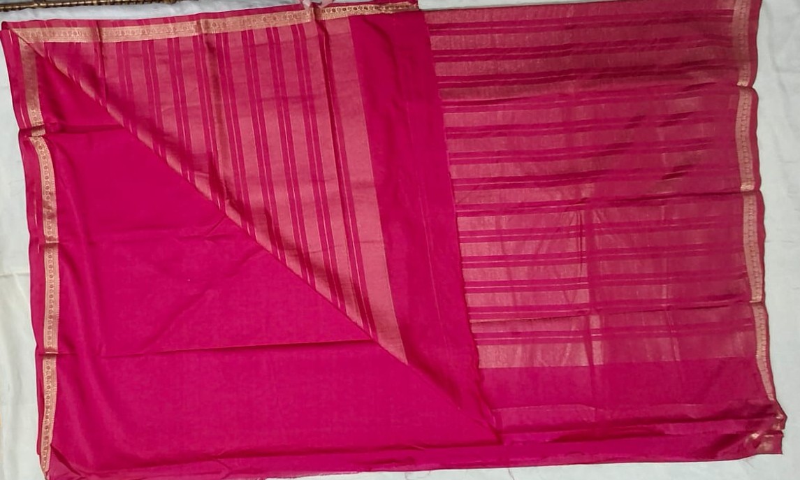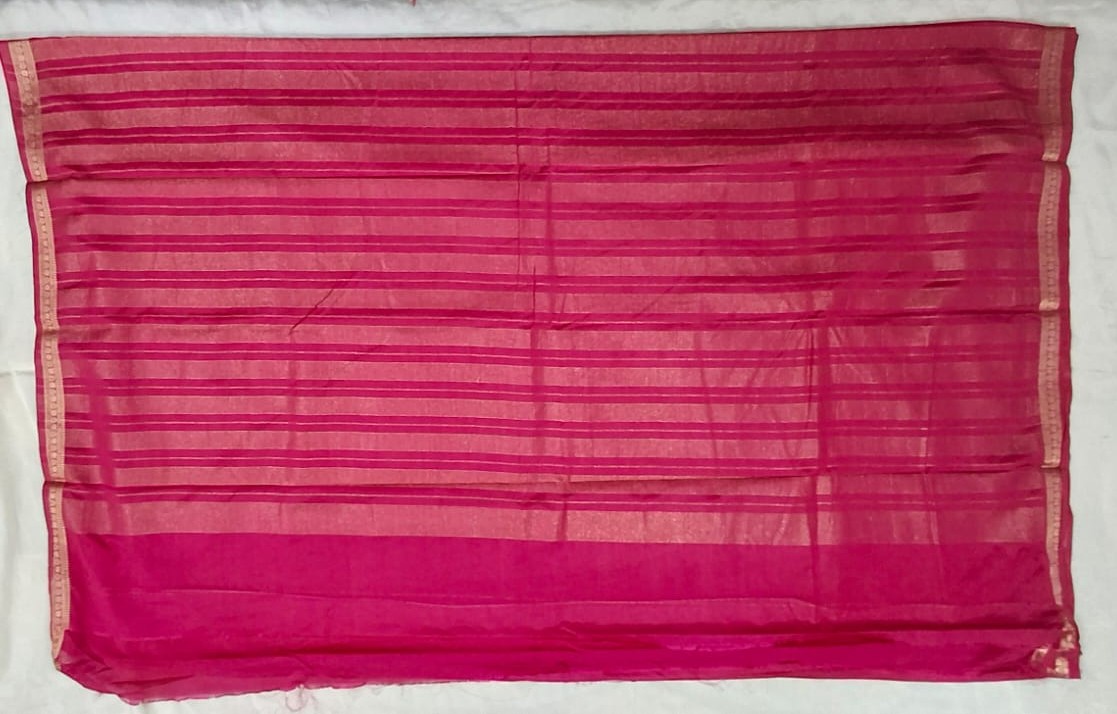 This exquisite saree features a beautiful interplay of textures and patterns. The main body showcases a rich, solid color with a subtle sheen characteristic of fine Japan Crepe, ensuring a beautiful drape that flows gracefully. The pallu and one of the borders reveal a captivating pattern of horizontal golden stripes, adding a traditional yet sophisticated contrast. The entire length is framed by a delicate golden zari border, which elevates the richness of the fabric.