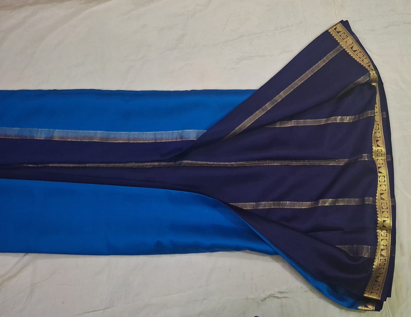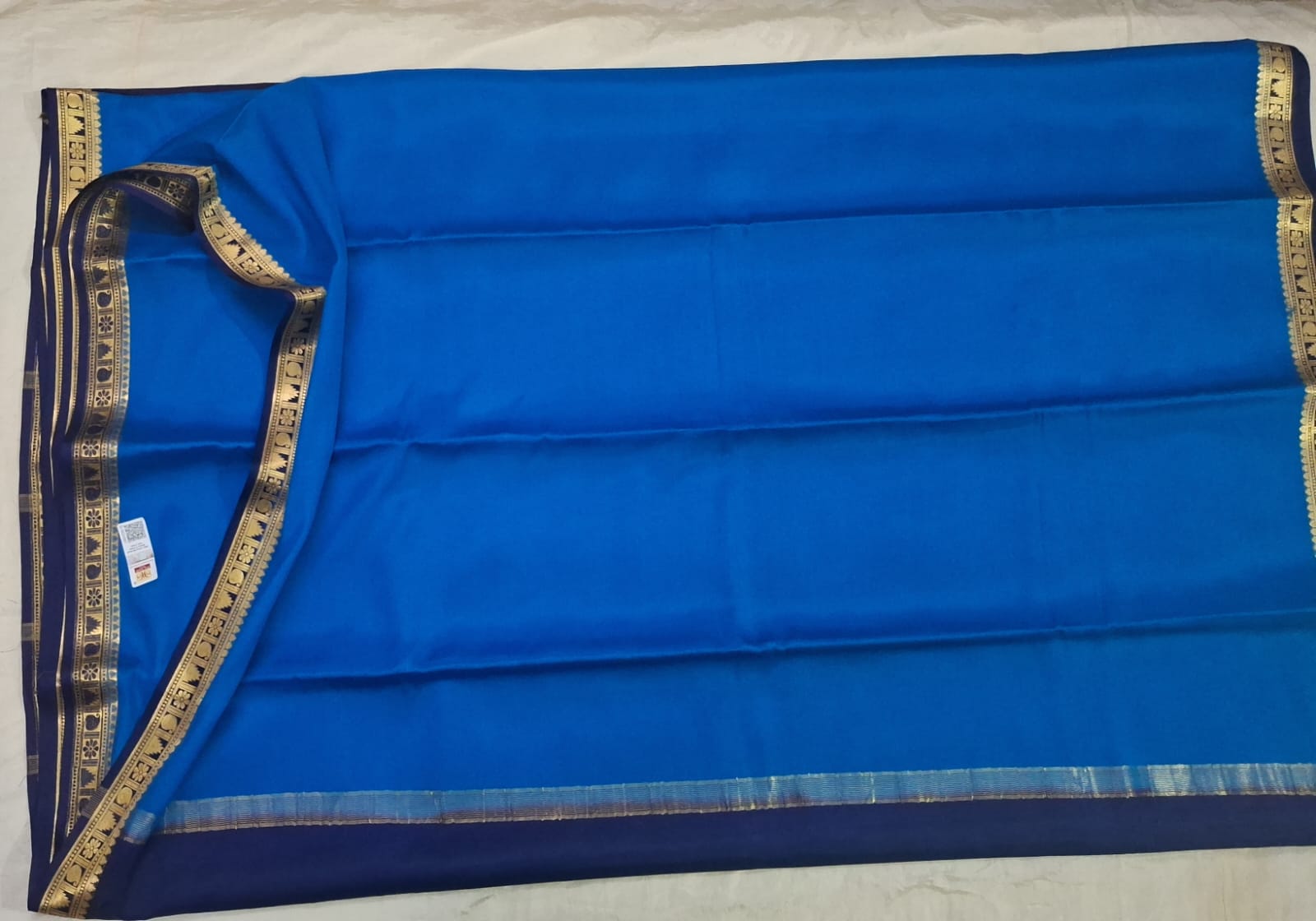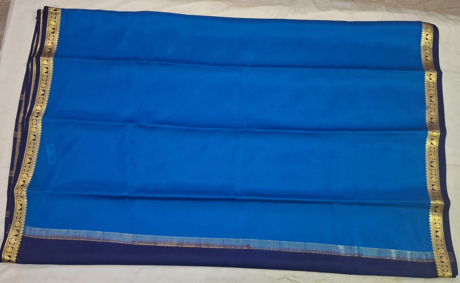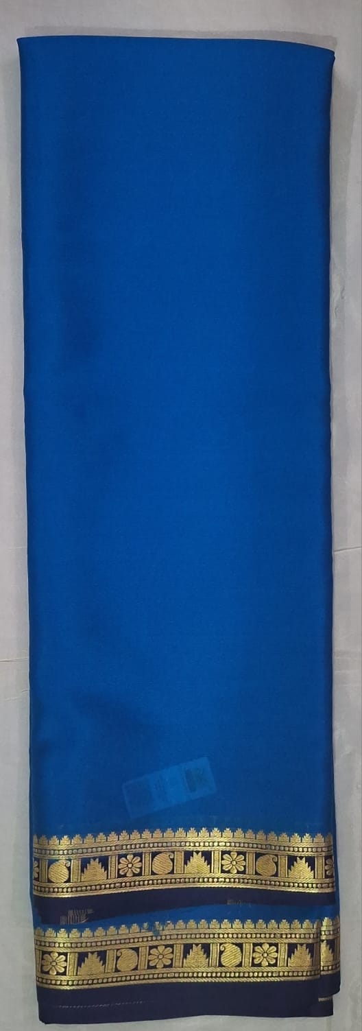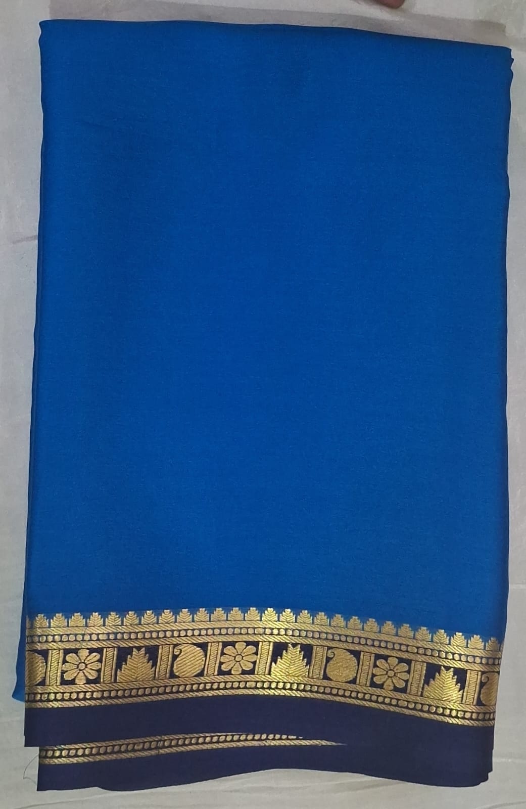 Crafted from Pure Mysore Crepe Silk with Silk Mark certified, this saree features a pure silver zari border β delicately dipped in gold to bring out a regal glow.