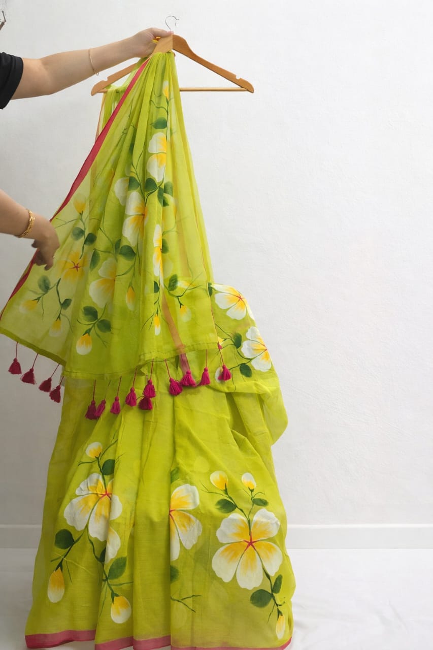 Step into effortless elegance with this unique piece. Crafted from pure, soft Mul Cotton and handwoven by skilled artisans, the saree drapes beautifully, offering superior comfort for warm days. The bright lime base is brought to life by original handpainted white and yellow floral designs, making each saree a truly wearable piece of art—no two pieces are alike. The pallu is finished with playful, contrasting pink tassels, adding a charming, contemporary touch. Ideal for casual outings, artistic everyday wear, or festive daytime events