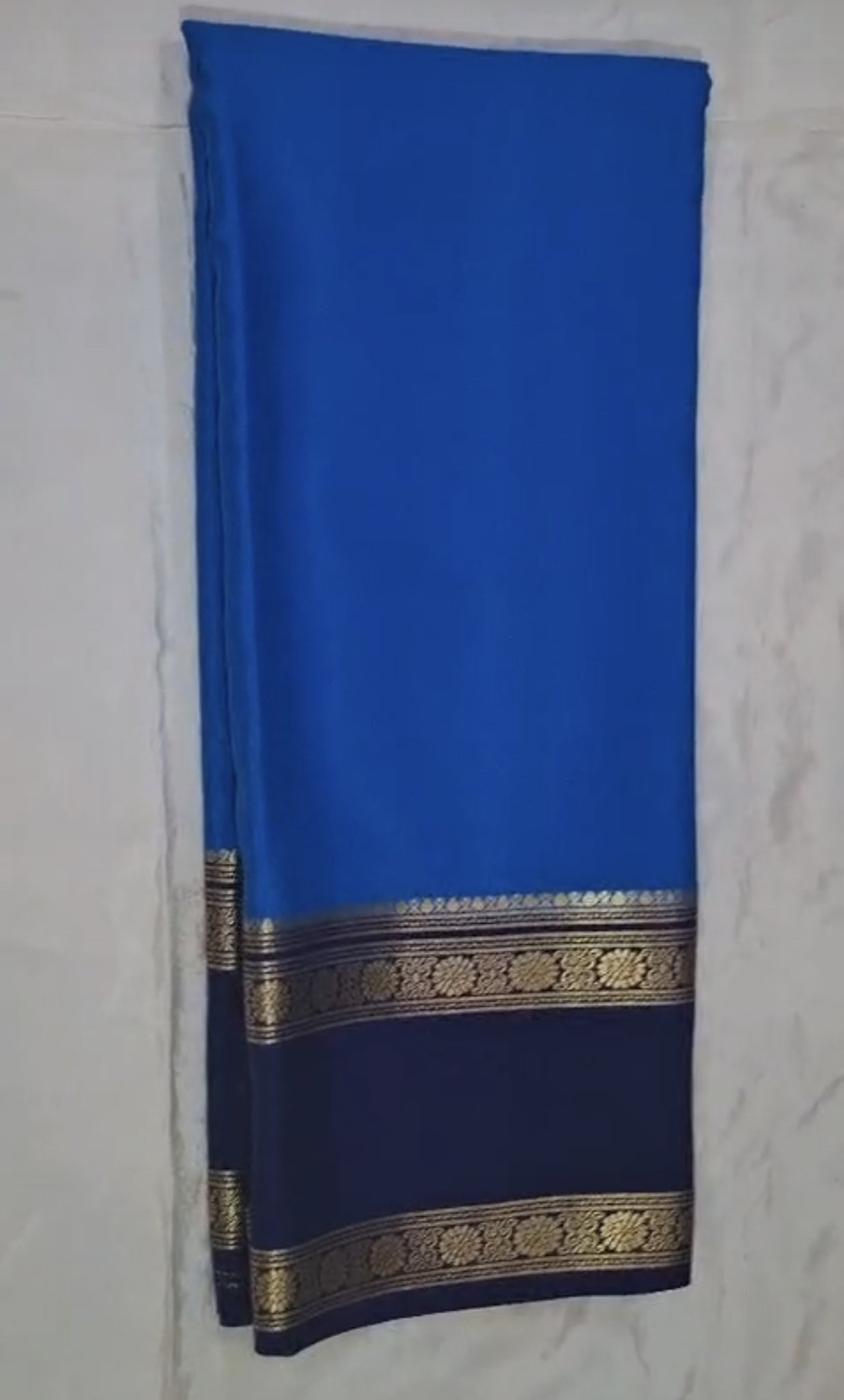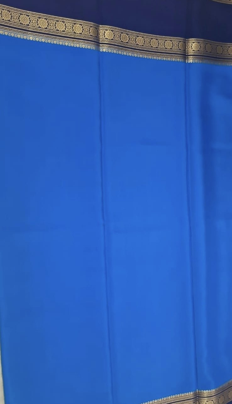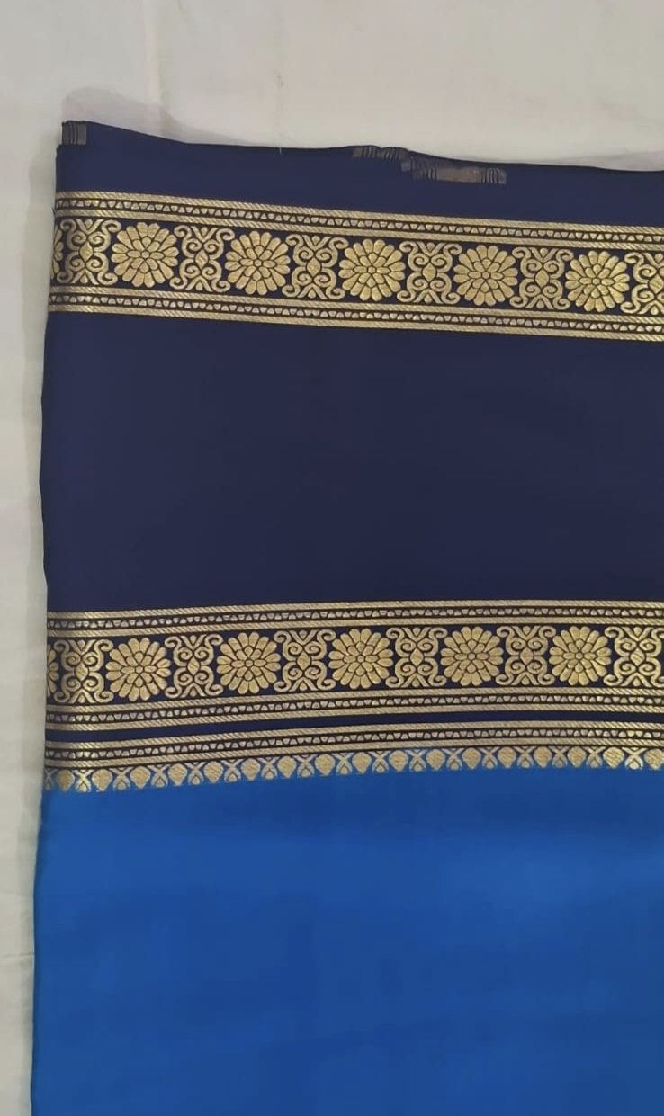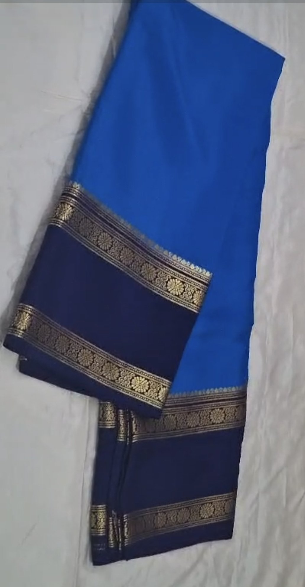 Crafted from Pure Mysore Crepe Silk, this saree features a pure silver zari border delicately dipped in gold, radiating a regal glow.